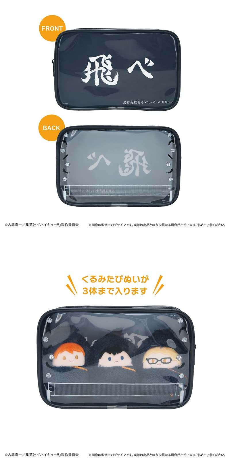横断幕クリアポーチの背面はバレーコート仕様。くるみたぴぬいが3体まで入る約H110 × W170 × D60mmサイズだ。