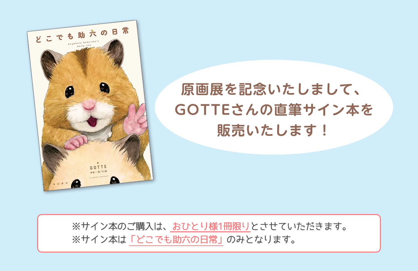 2026年3月28日より開催される「Ham Ham collection! 助六の日常 原画展」では、GOTTEさんによる原画、複製原画のほか、オリジナルグッズなども販売!
