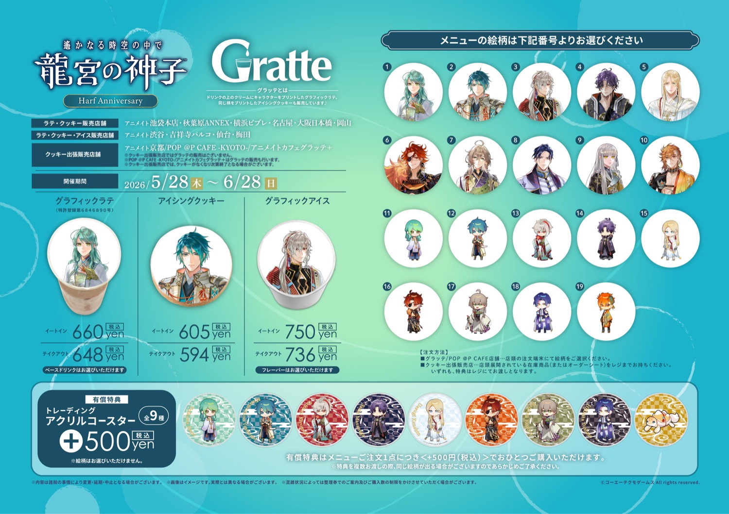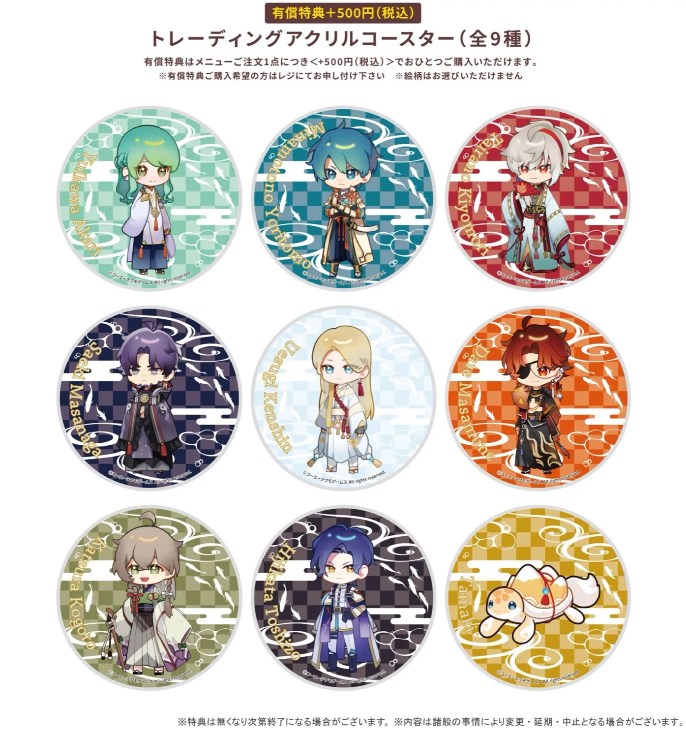 「遙かなる時空の中で 龍宮の神子 × アニメイト10店舗」コラボでは、コラボメニューを1品注文ごとに、+500円 (税込) で有償特典の「トレーディングアクリルコースター 全9種 / ランダム」を1枚購入可能。