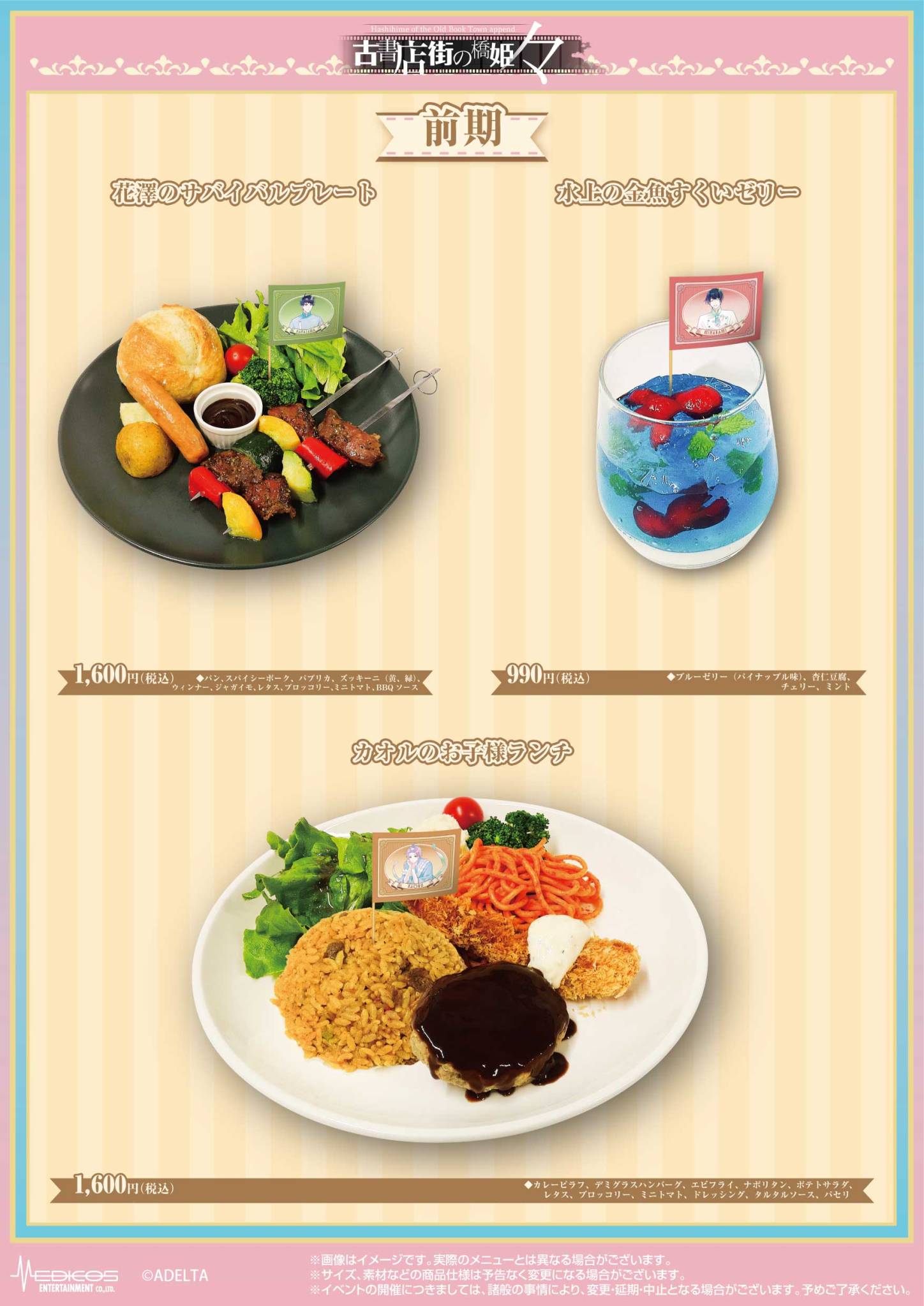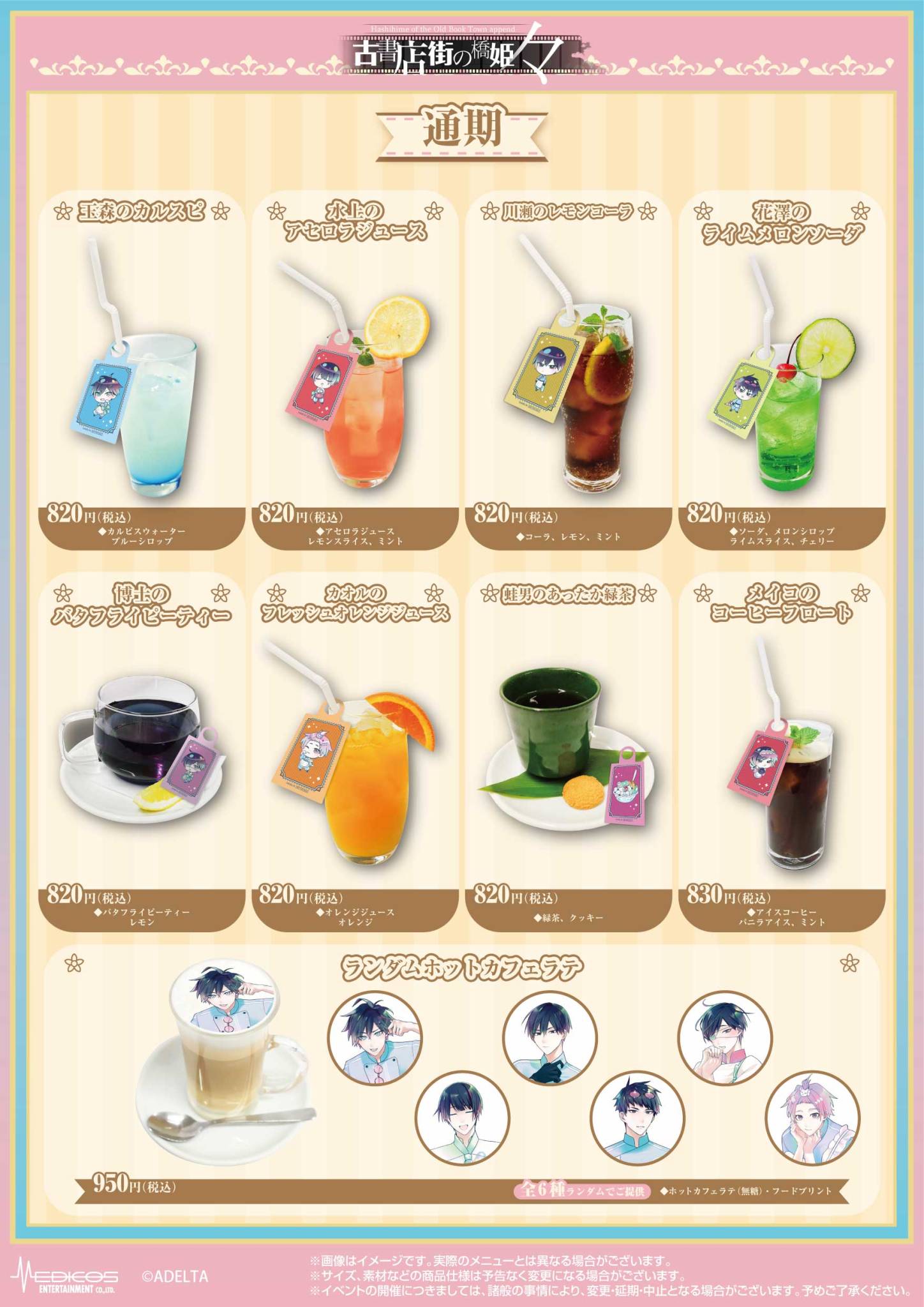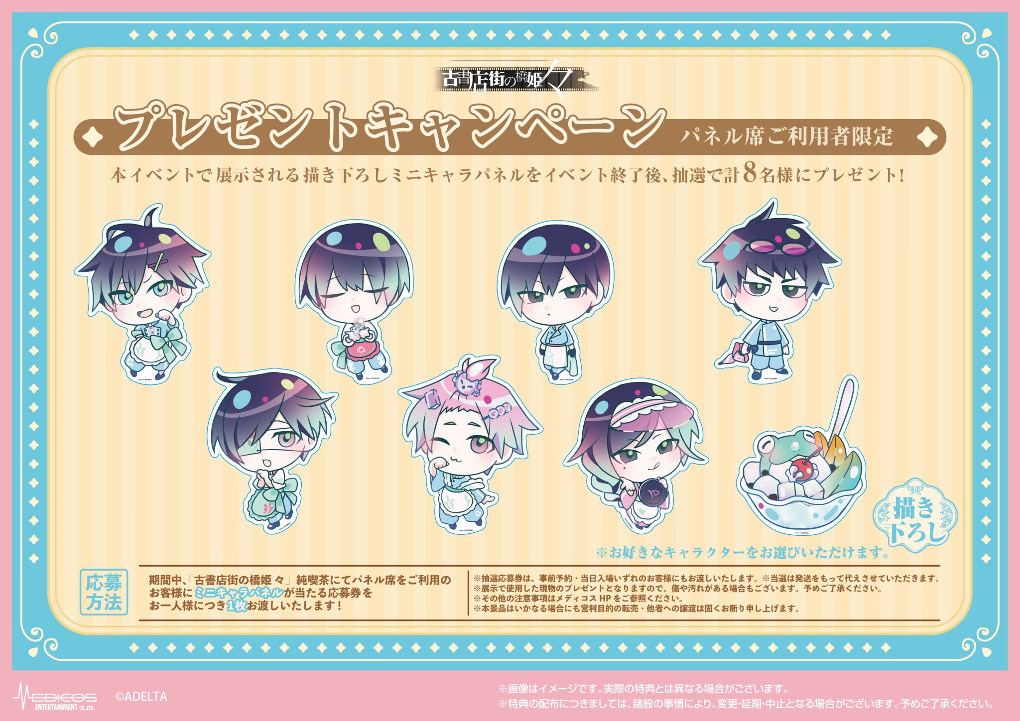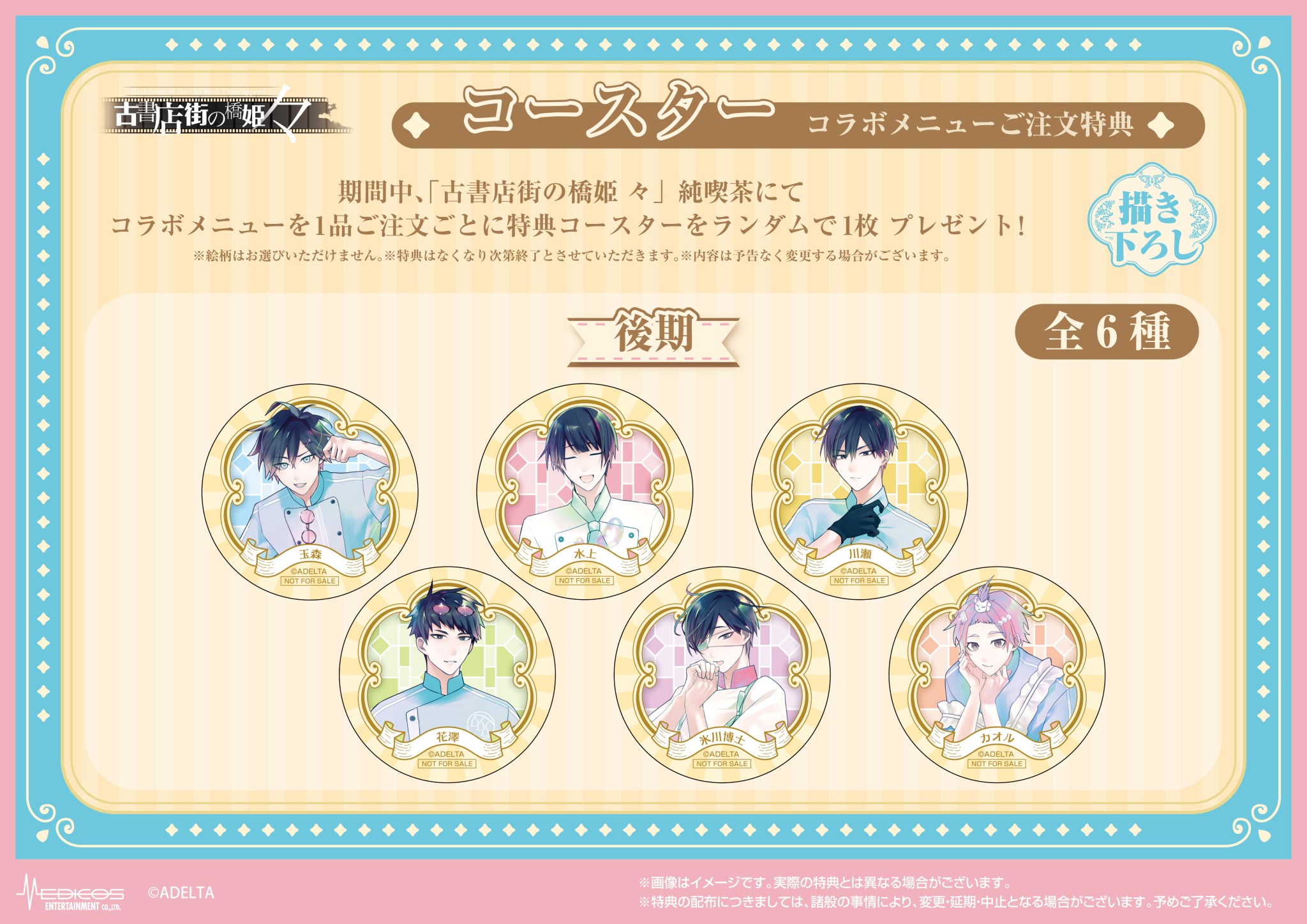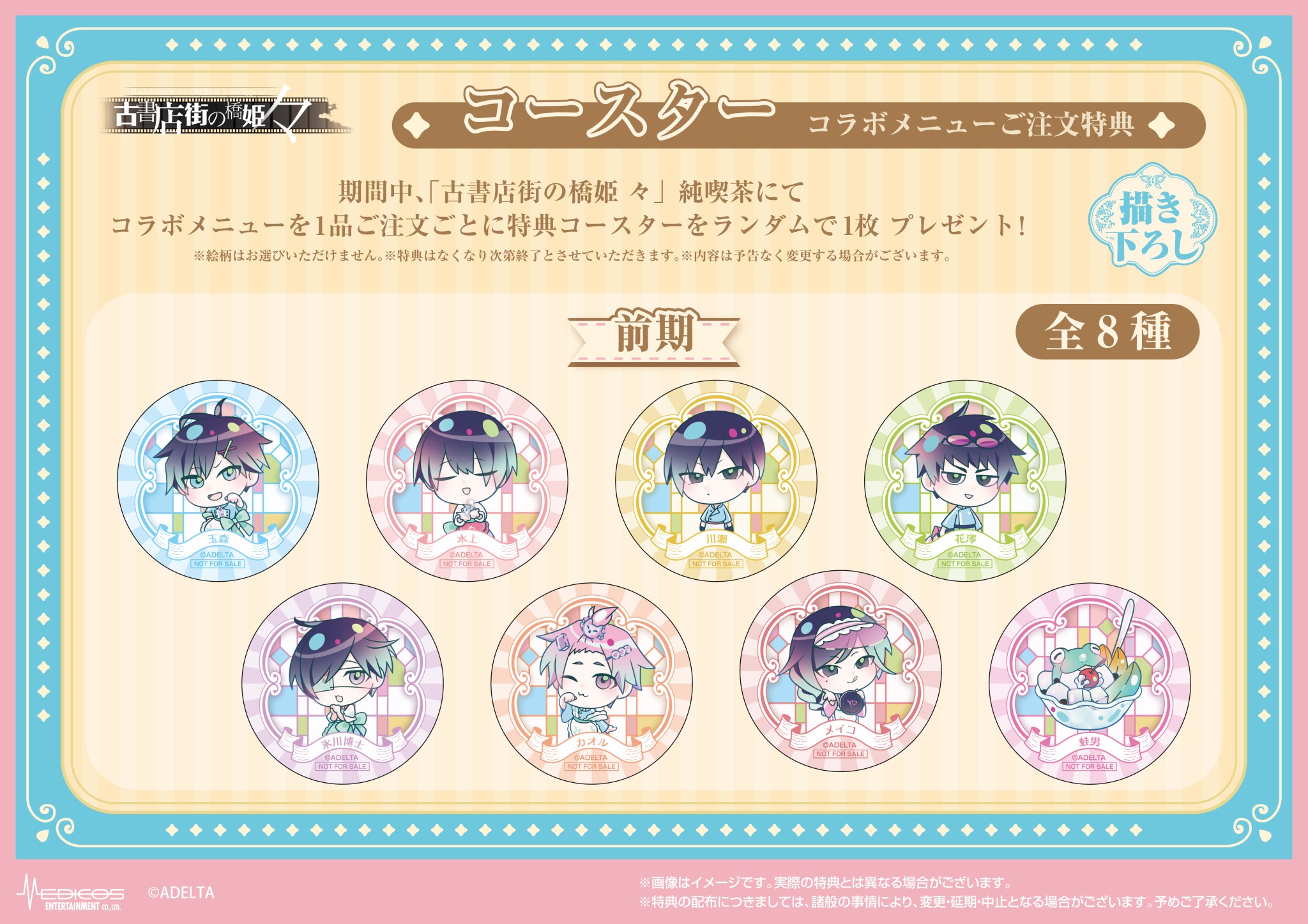 「古書店街の橋姫 々」コラボカフェでは、作品の舞台である大正時代の空気感や、玉森・水上・花澤・川瀬・博士・カオル・蛙男・メイコらをイメージしたコラボメニューがお楽しみいただける他、メニューを注文の方には期間に応じた限定ノベルティー「コースター」がランダムに1枚プレゼントされる。