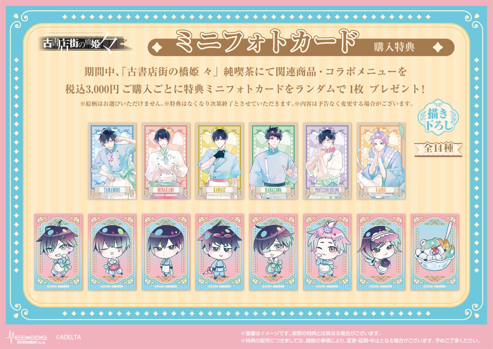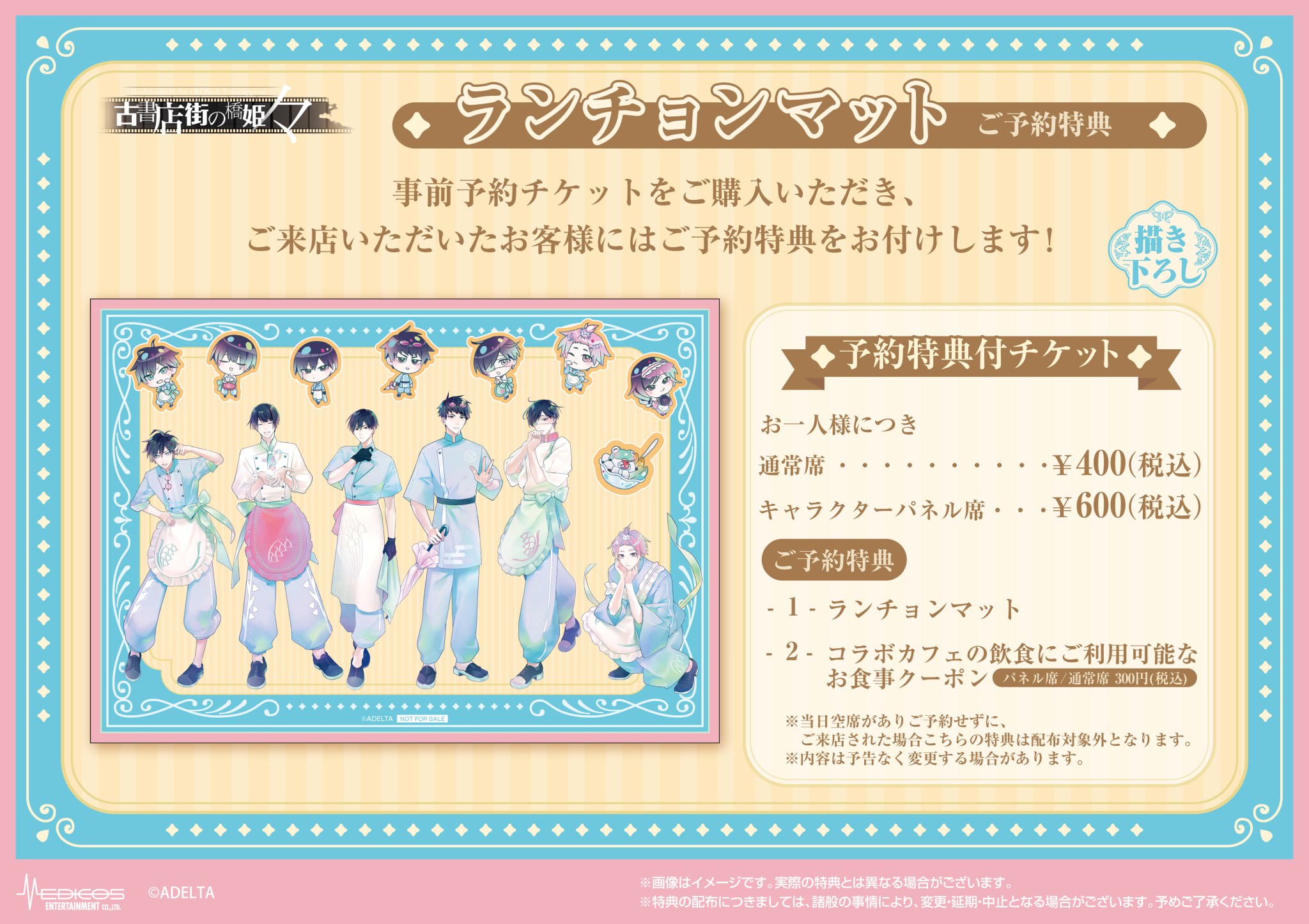 また、関連商品・コラボメニューを3,000円購入(税込)ごとに特典として「ミニフォトカード 全14種」をランダムに1枚、事前予約チケット(400円/600円)の購入特典として「ランチョンマット 全1種」に加え、「コラボカフェの飲食に利用可能なお食事クーポン(300円分)」も付属!