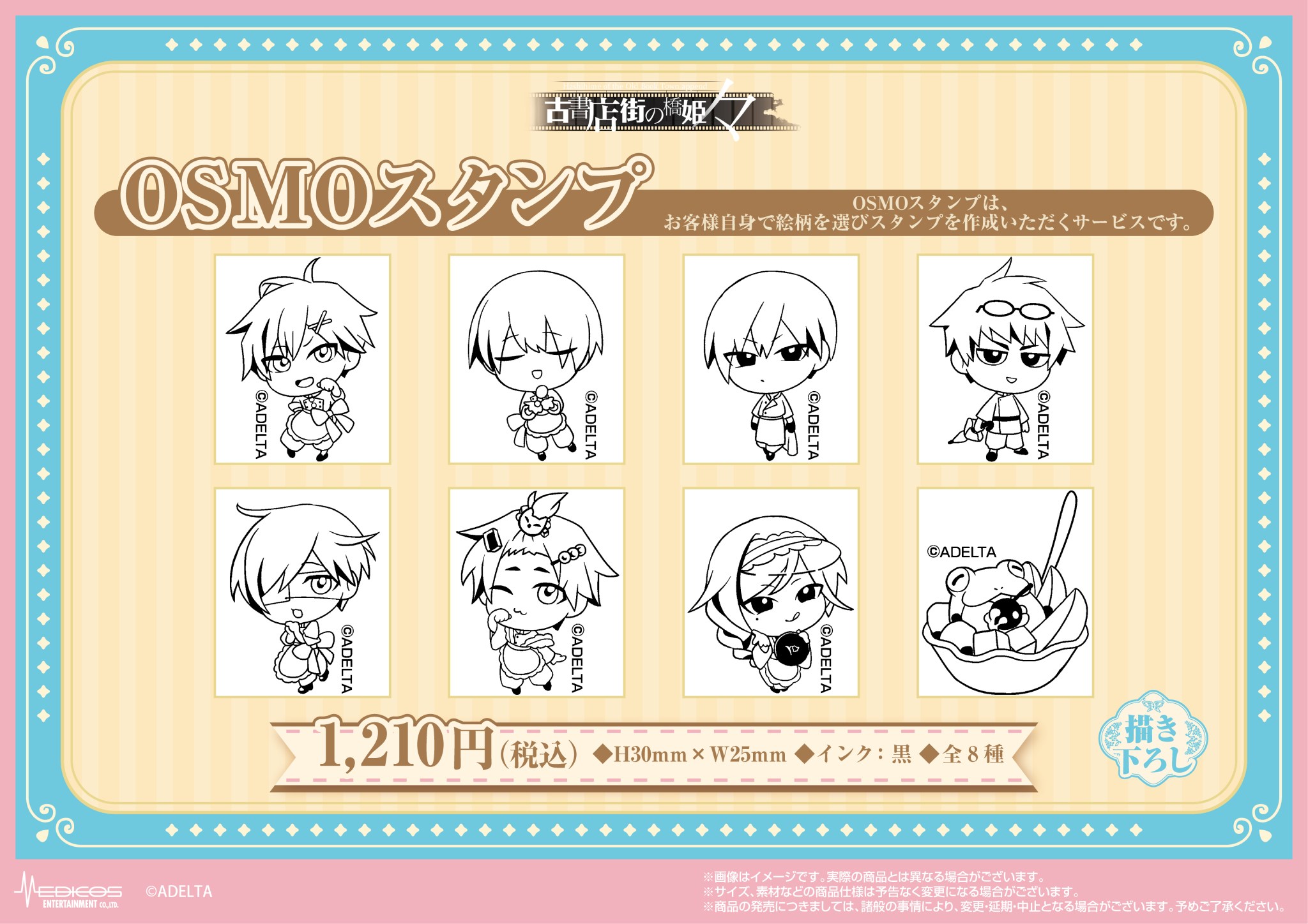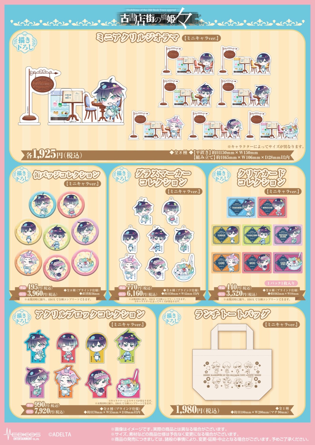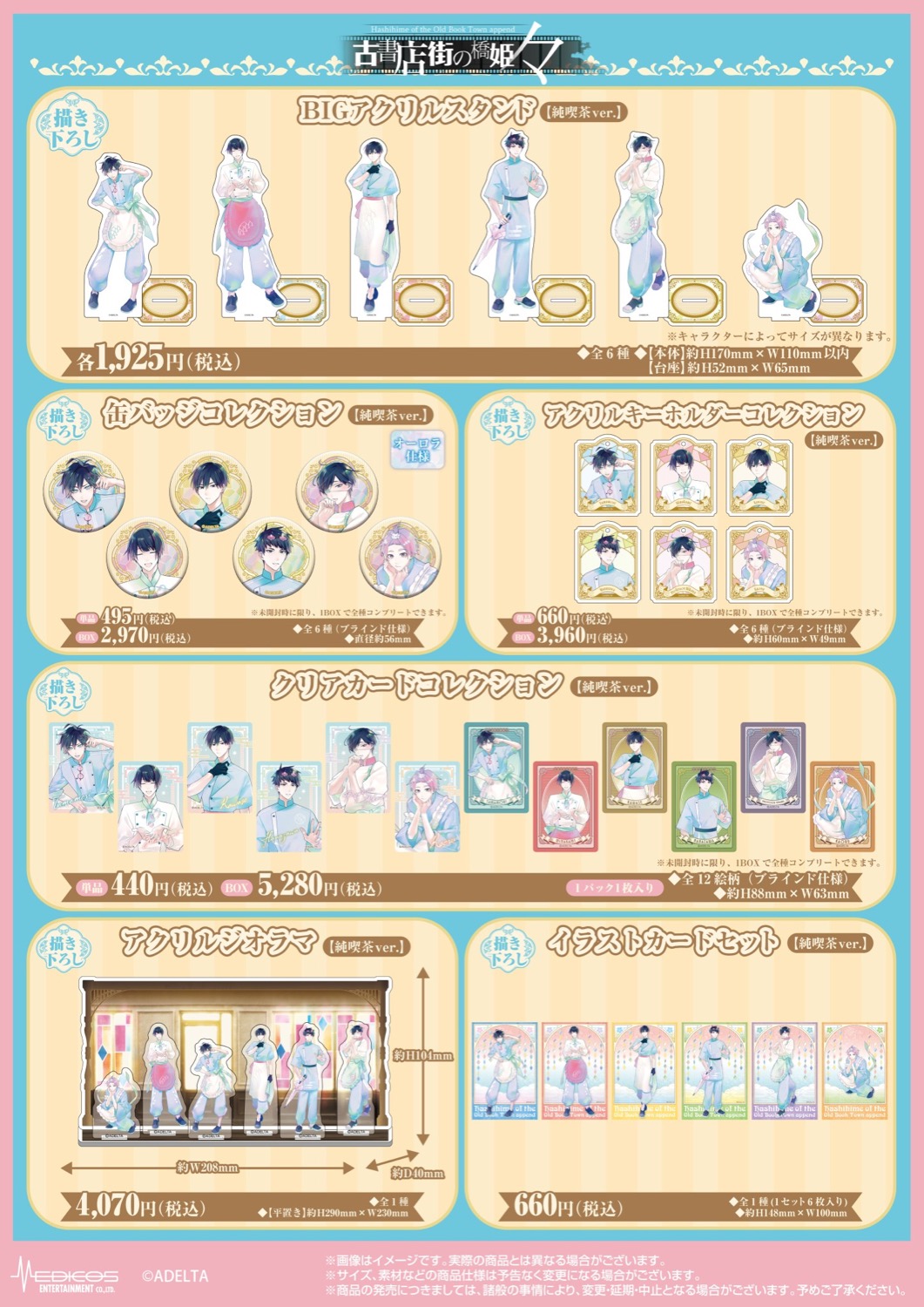 玉森・水上・花澤・川瀬・博士・カオルの6名が「純喫茶店員」に扮したスタイリッシュな等身ビジュアルや、メイコと蛙男も加わったキュートなミニキャラビジュアル(全8名)を使用した、「BIGアクリルスタンド」や「ミニアクリルジオラマ」「OSMOスタンプ」などがラインナップ!