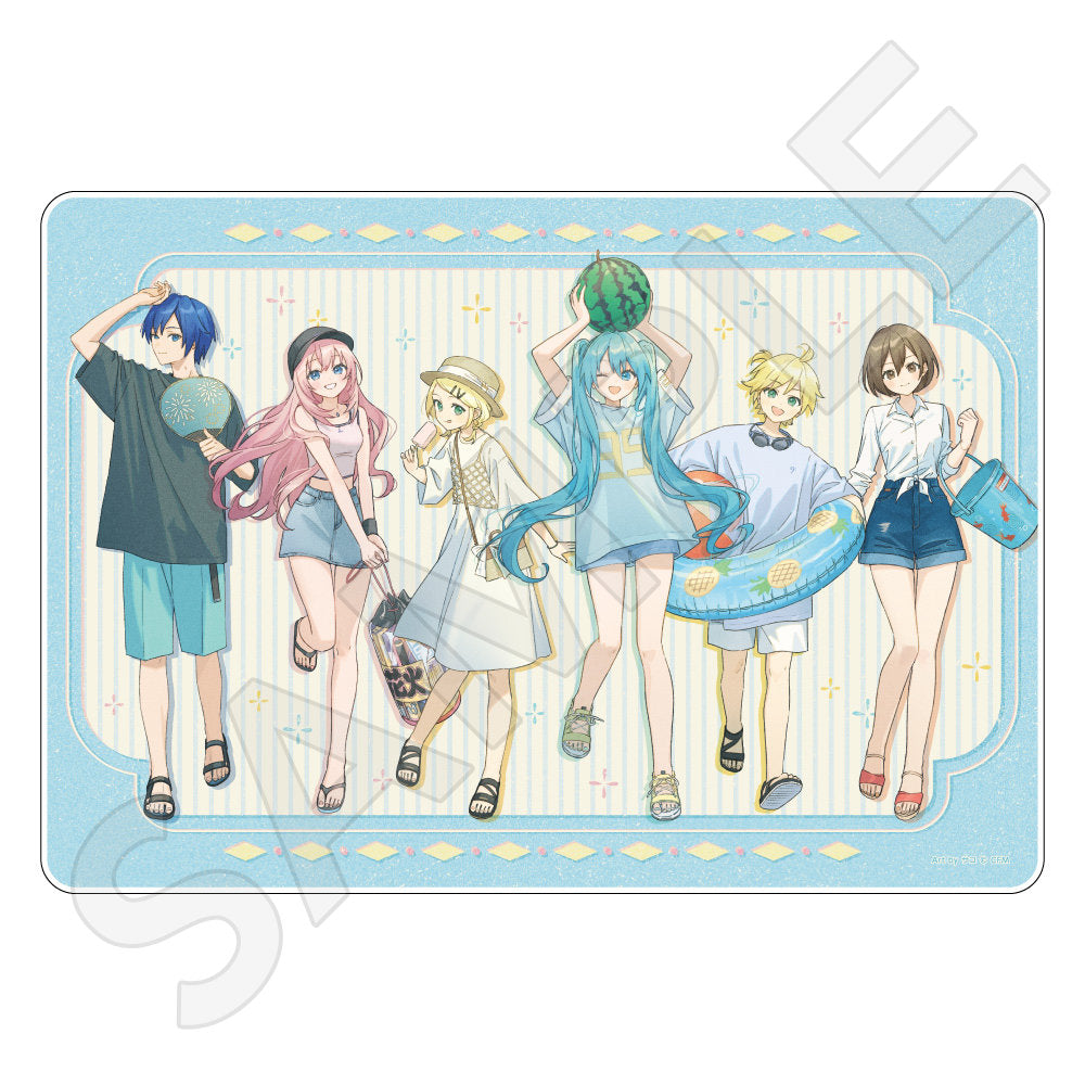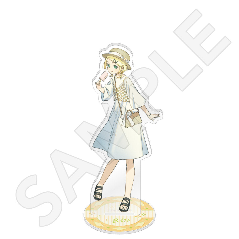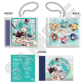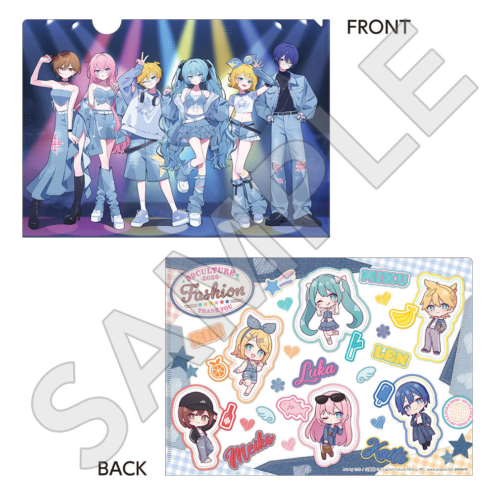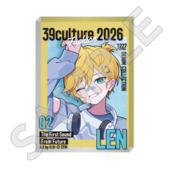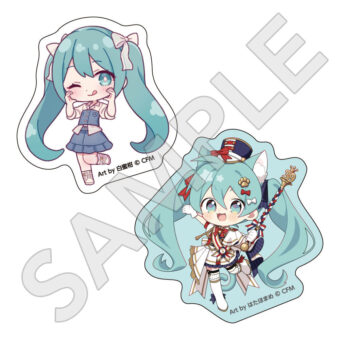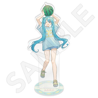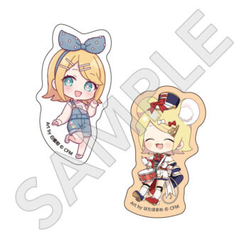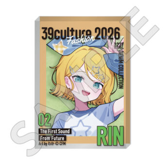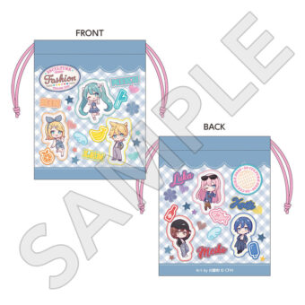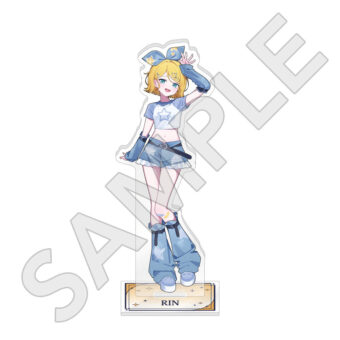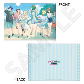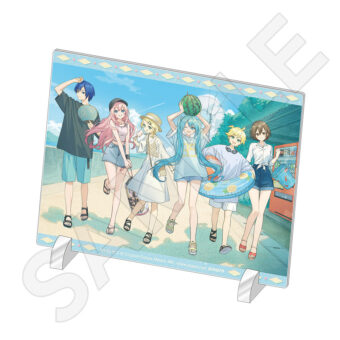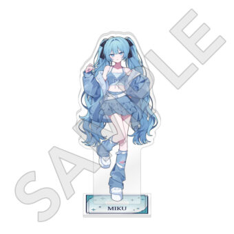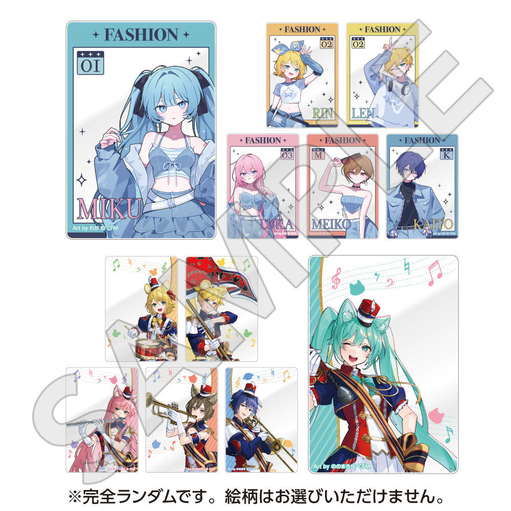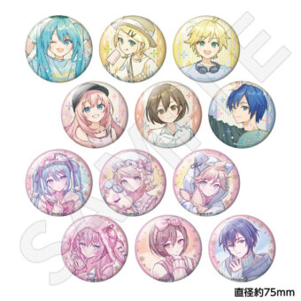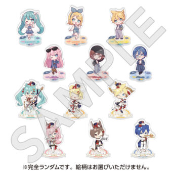 水色コーデで揃えたビジュアルや、演奏する初音ミク・鏡音リン・鏡音レンたちのイラストを使用した「トレーディング大き目ホログラム缶バッジ」「トレーディング箔押しカード」「FASHION アクリルスタンド」「MUSIC クリアファイル」などがラインナップする。