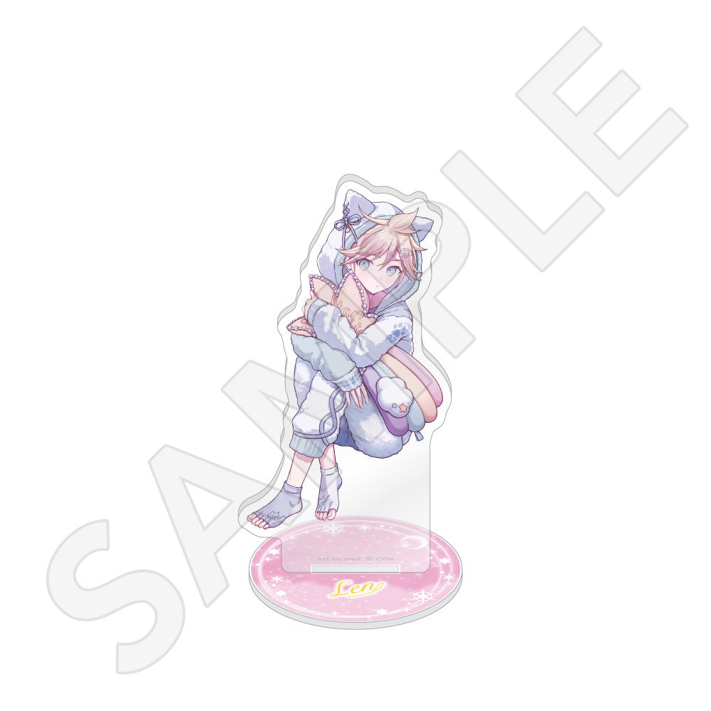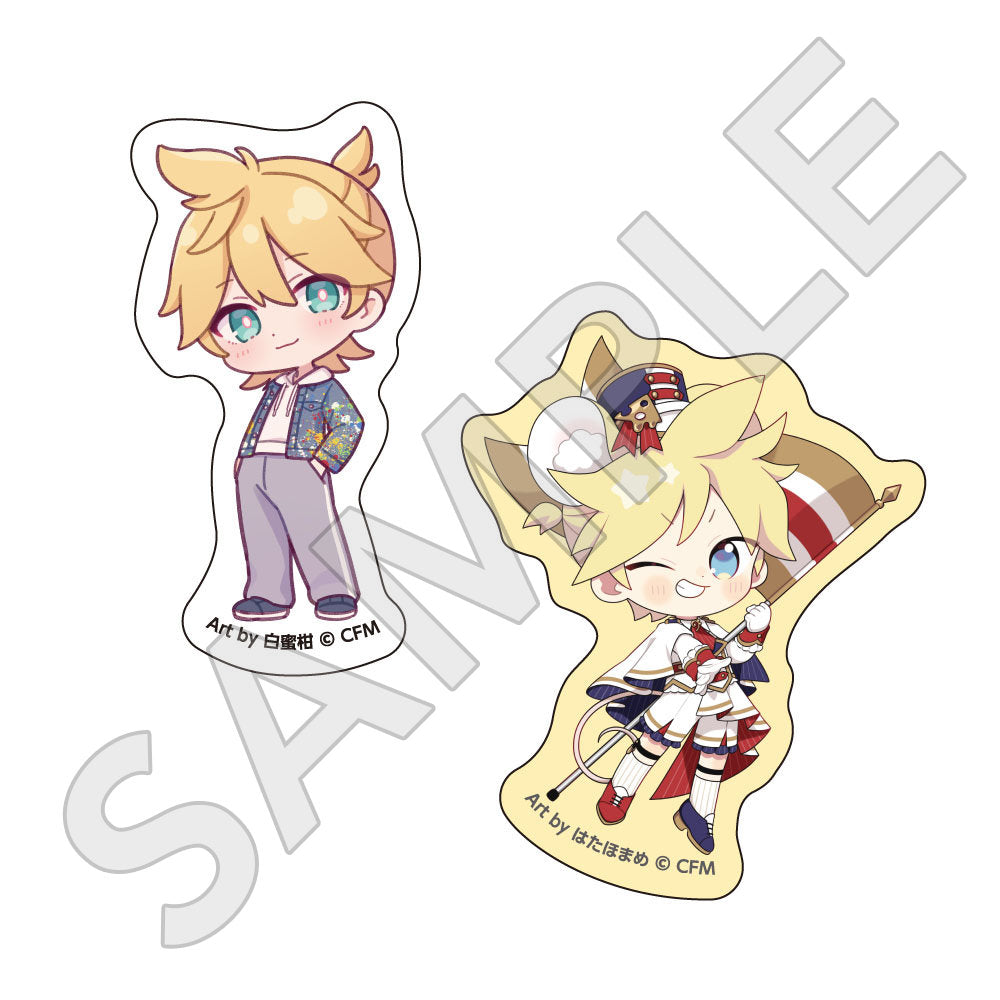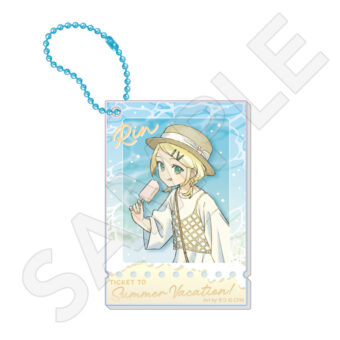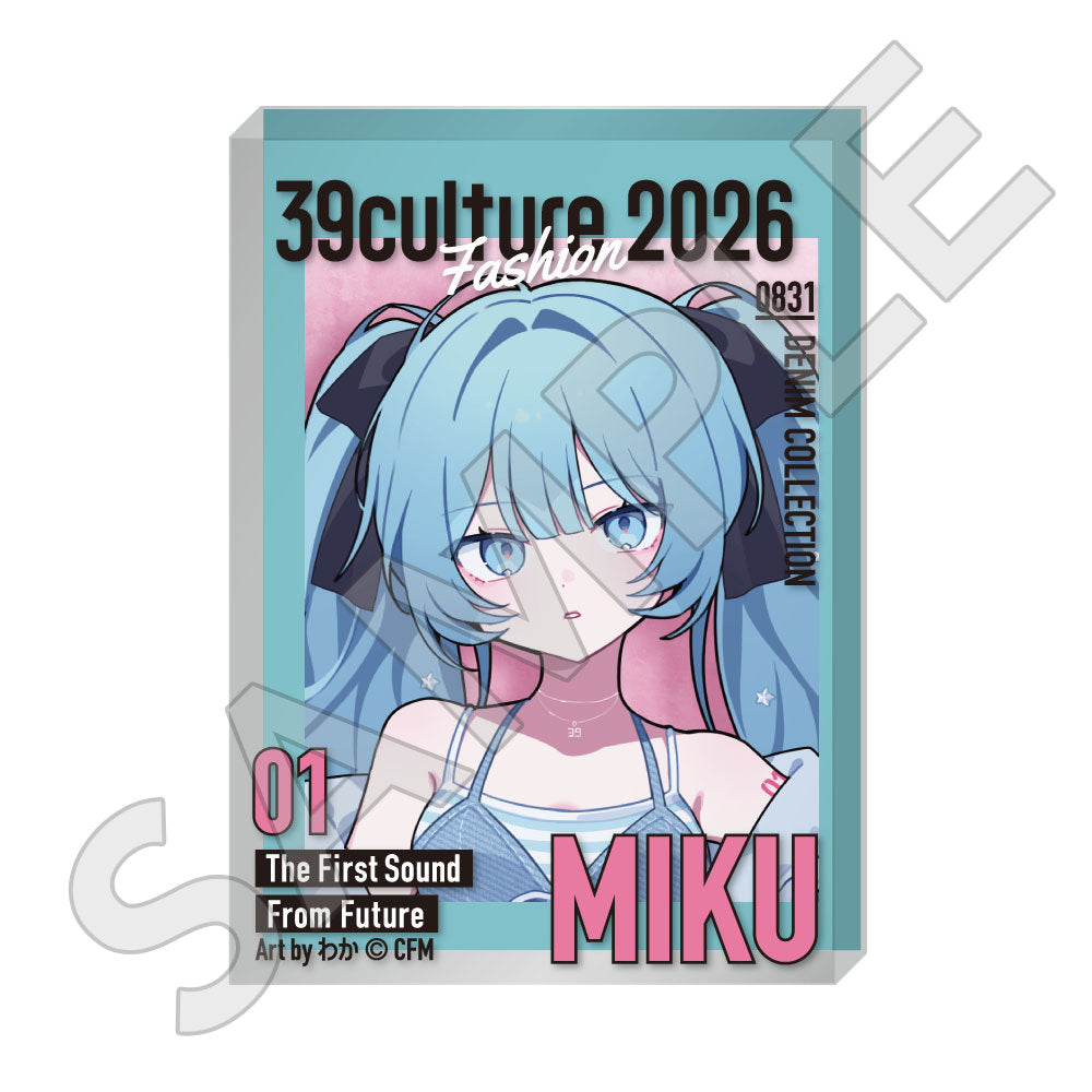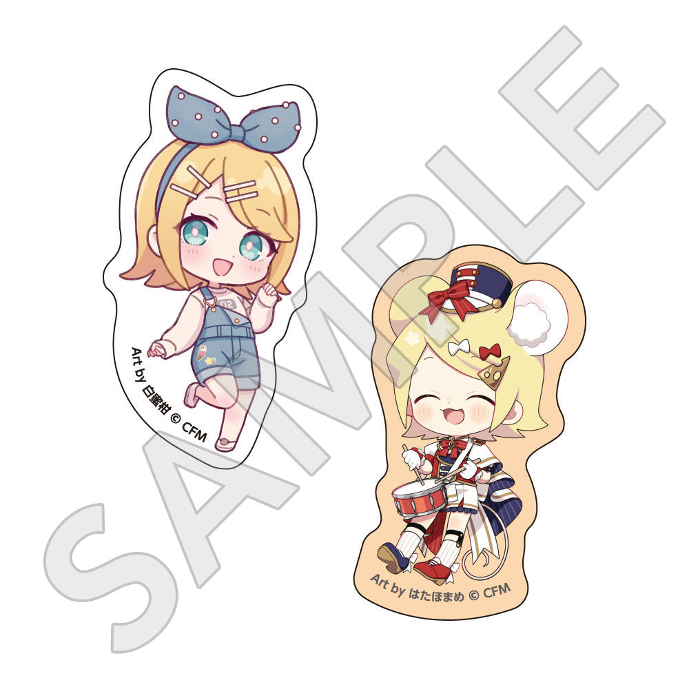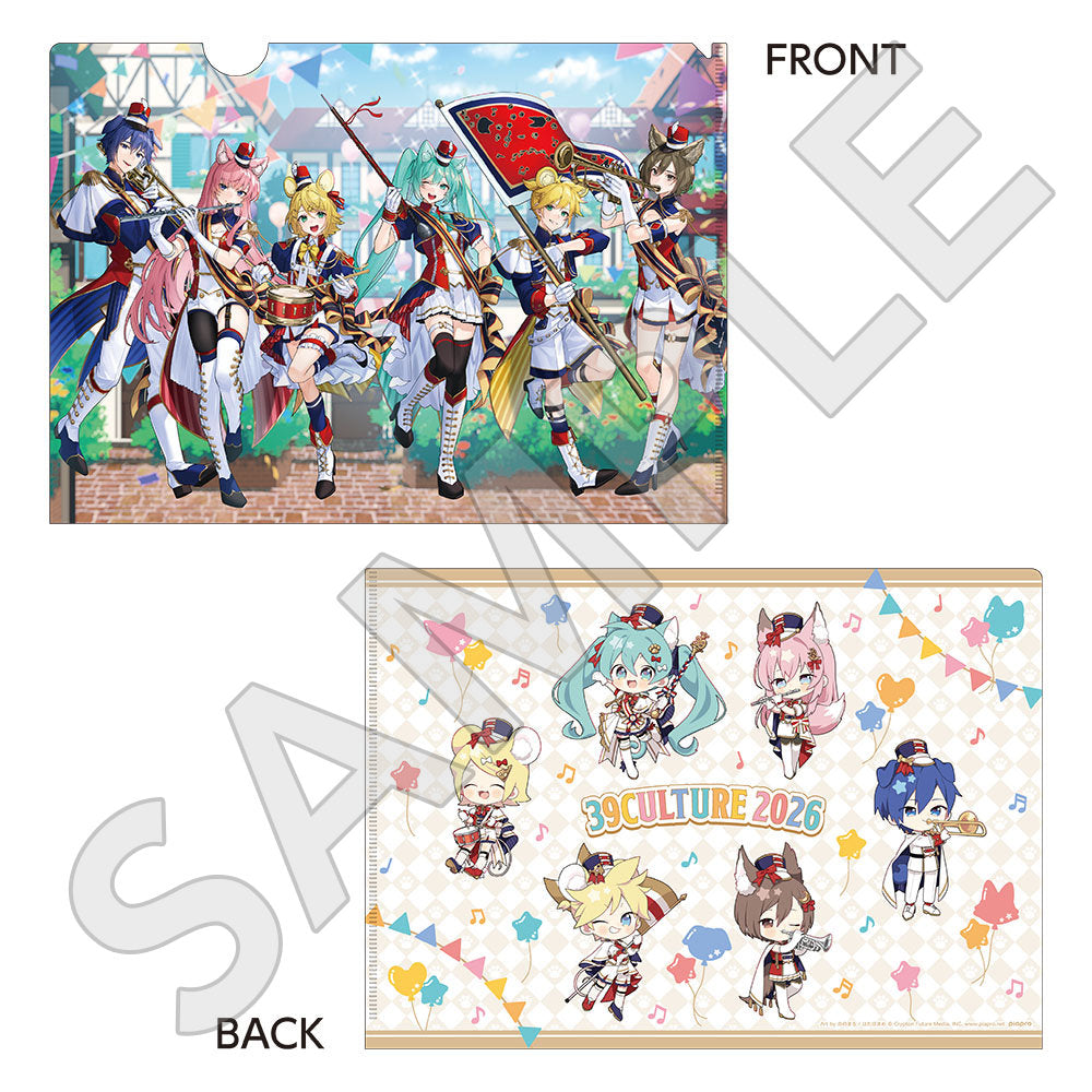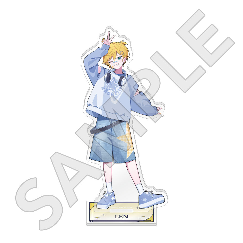水色コーデで揃えたビジュアルや、演奏する初音ミク・鏡音リン・鏡音レンたちのイラストを使用した「トレーディング大き目ホログラム缶バッジ」「トレーディング箔押しカード」「FASHION アクリルスタンド」「MUSIC クリアファイル」などがラインナップする。