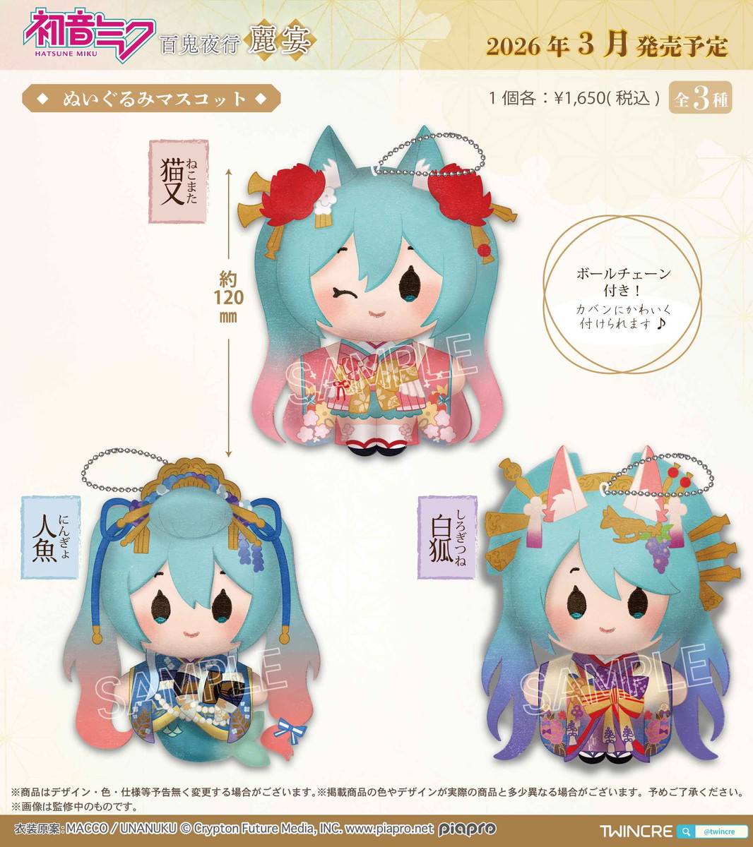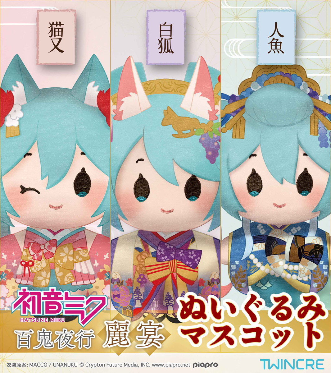 国内外で爆発的な人気を誇るバーチャルシンガー「初音ミク」から、「百鬼夜行 ~麗宴~」の「ぬいぐるみマスコット」が2026年3月にツインクルより発売される。