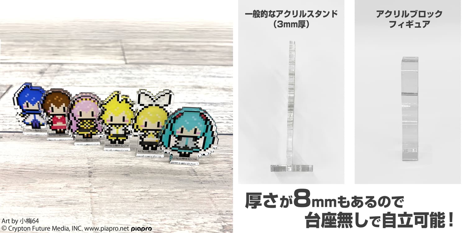 特に注目したいのは、厚みのある質感が魅力のアクリルブロックフィギュアだ。小梅64氏が描くドット絵のミクたちは、懐かしくも新しい存在感を放つ 。透明度の高いアクリルが生む奥行き。デスクに置けば、光を透過してドット絵のイラストが映え、ふとした瞬間に目が止まりそうだ。