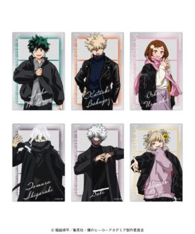 黒アウターコーデに身を包む、デク・爆豪・お茶子・死柄木・荼毘・トガたちのイラストを使用した「トレーディング カンバッジ」「トレーディング ビッグカンバッジ オーロラVer.」「トレーディング フレームマグネット」「トレーディング クリアアートカード」などがラインナップする。