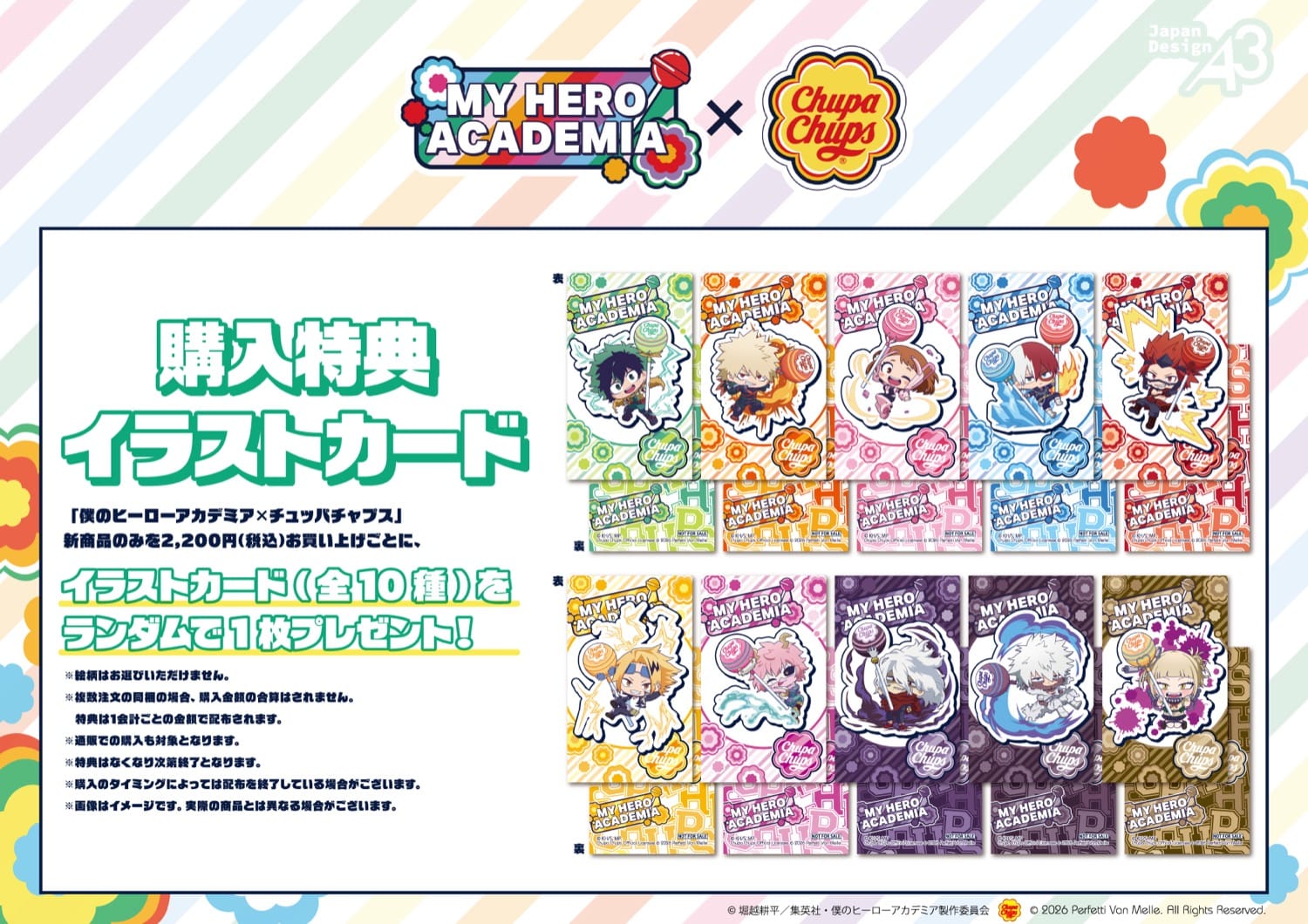 「僕のヒーローアカデミア × チュッパチャプス」ポップアップストアにて、グッズをお買い上げ2,200円(税込)毎に特典として「イラストカード 全10種」がランダムに1枚プレゼントされる。