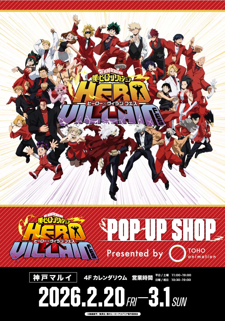 全世界累計発行部数1億部を突破した「堀越耕平」先生による大人気漫画を原作とするTVアニメ「僕のヒーローアカデミア (ヒロアカ)」× 神戸マルイにて、ポップアップストア「『僕のヒーローアカデミア』HERO × VILLAIN FES.〈ヒーロー×敵〈ヴィラン〉フェス〉 POP UP SHOP presented by TOHO animation」が、2026年2月20日より開催される。