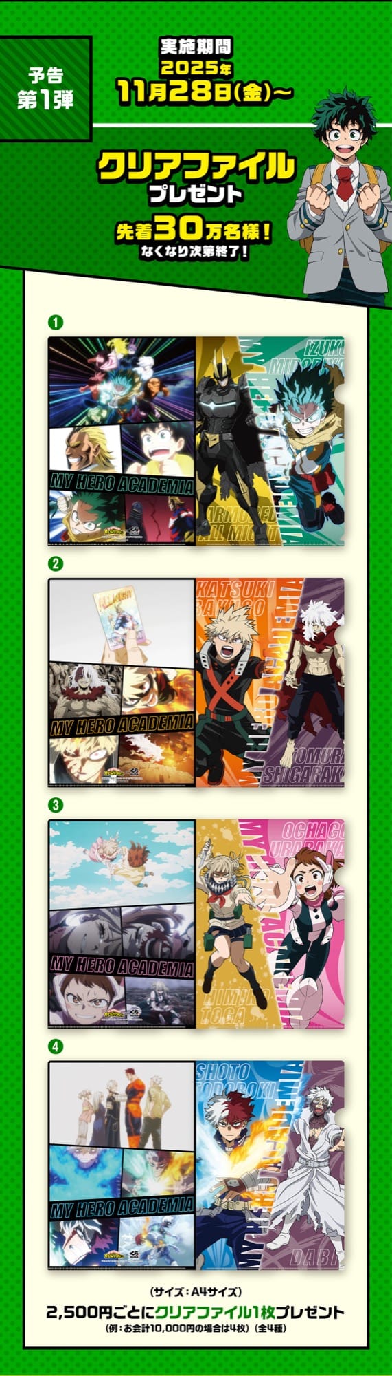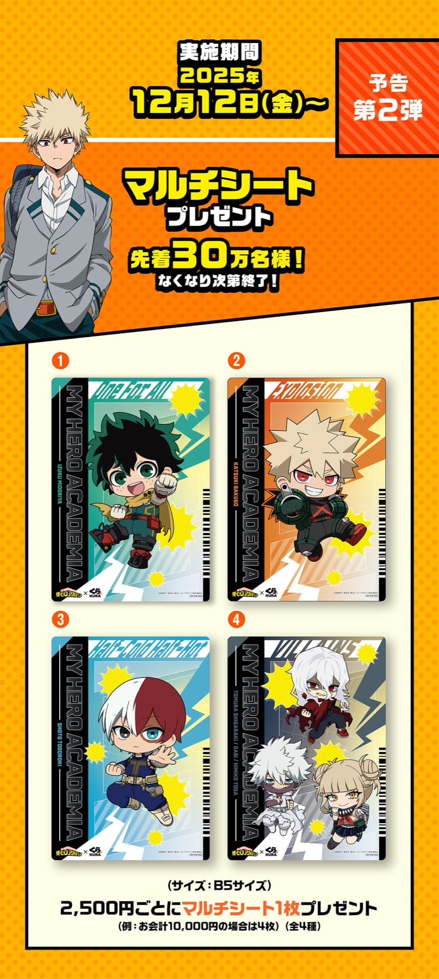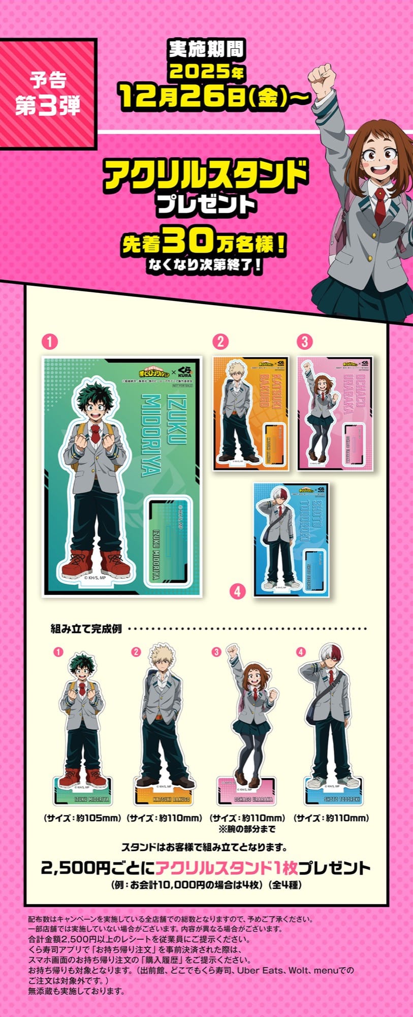 「僕のヒーローアカデミア × くら寿司全国」コラボキャンペーン期間中、2,500円 (税込) の利用ごとに、「ヒロアカ」クリアファイルやマルチシート、コラボ限定ビジュアルを使用したアクリルスタンドなど、オリジナルグッズをプレゼント!
