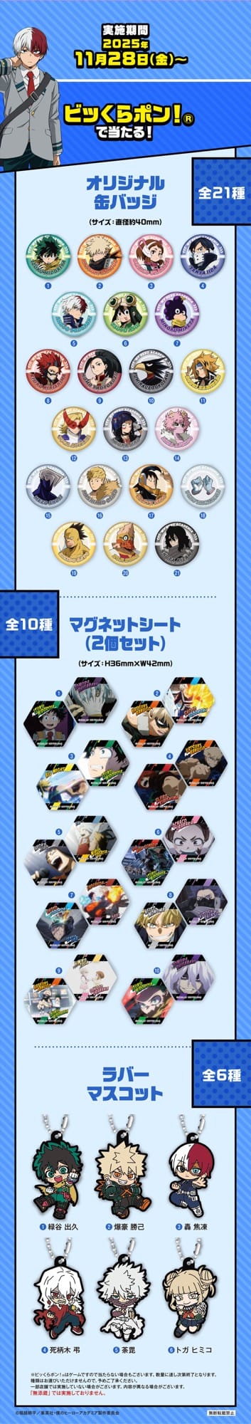 2025年11月28日〜12月31日まで、くら寿司店頭の各テーブルに設置された「ビッくらポン!」に「ヒロアカ」景品が登場! (※景品がなくなり次第終了)