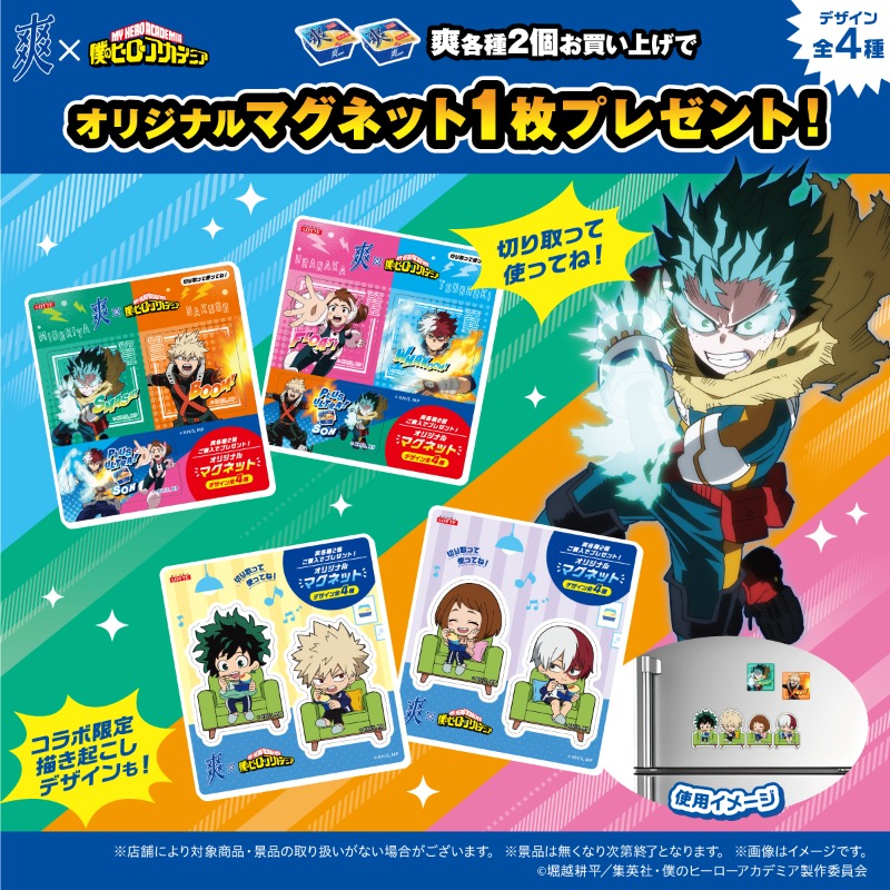 「ヒロアカ × 爽」コラボでは、対象の店舗にて「爽」各種2個を同時に購入した方に、コラボ限定デザインの「オリジナルマグネット 全4種」の中から1枚をプレゼント!