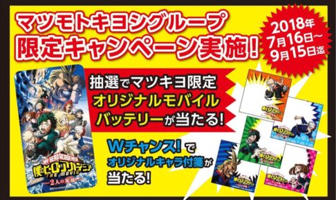 劇場版「僕のヒーローアカデミア THE MOVIE~2人の英雄 (ヒーロー)~」× 全国のマツモトキヨシグループにて7月16日よりコラボキャンペーン開催決定!対象商品500円以上(税込)のレシートでWEB応募するとマツキヨ限定「ヒロアカ」モバイルバッテリーなどが抽選で当たる!またハズレた方にもオリジナル付箋が当たるWチャンス賞も!!応募締切は9月15日(土)まで、ヒロアカ × マツキヨ開催期間は2018年7月16日〜9月15日まで!!