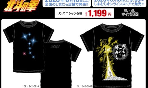 「北斗の拳 × しまむら」では、死の運命を背負った者の上に輝くとされ、北斗七星のそばに寄り添うように小さく存在する『死兆星』が輝くデザインや、ラオウの生涯最後の台詞『我が生涯に一片の悔い無し!!』をデザインしたコラボT 2種類が登場!