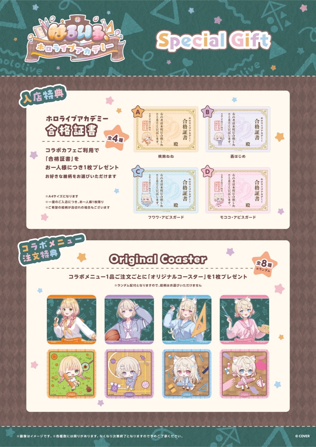 コラボカフェでは、コラボカフェ利用で入店特典として「ホロライブアカデミー 合格証書 (全4種)」をお一人様につき1枚お好きな絵柄をプレゼント!