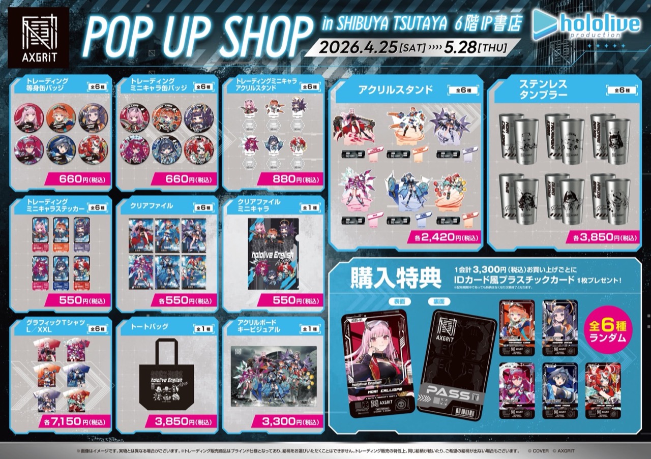 2026年4月25日(土)より、SHIBUYA TSUTAYA #IP書店 にてAXGRIT 第5弾企画『#ホロライブEnglish -Myth-&-Promise-』 のPOP UP SHOPを開催‼Anti × Gravity Unitを身にまとった6人のグッズを販売!限定ノベルティの配布やさらに「#ハコス・ベールズ」のフィギュア展示も!!… https://t.co/yXLN6uCCs7