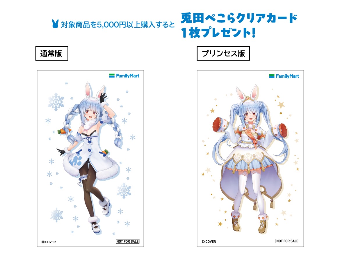 「兎田ぺこら × ファミリーマート全国」では、対象商品を5,000円(税込)以上購入した方に「兎田ぺこらクリアカード」を1枚プレゼント。