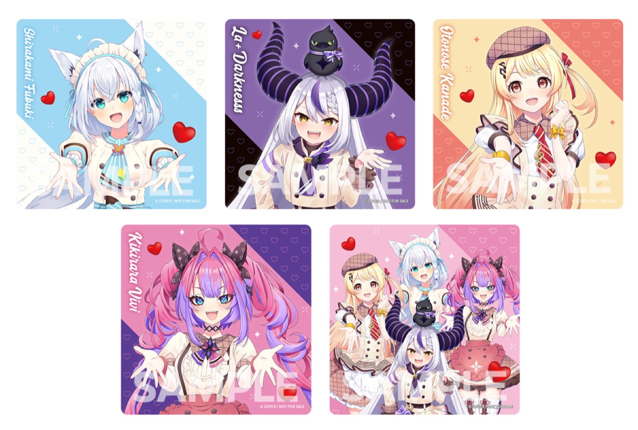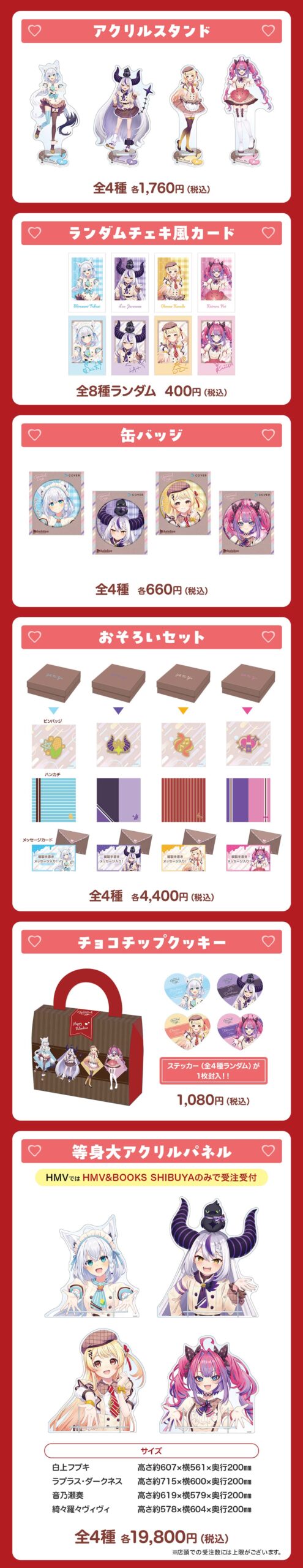 白上フブキ / ラプラス・ダークネス / 音乃瀬奏 / 綺々羅々ヴィヴィが、ハートやリボンをあしらった“バレンタイン”イメージの衣装に身を包んだ描き下ろしイラストを使用した「アクリルスタンド」のほか、チョコレート背景やサイン入り風デザインの「ランダムチェキ風カード」「缶バッジ」などがラインナップする。