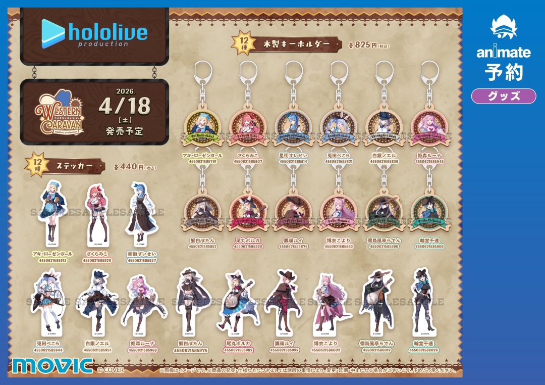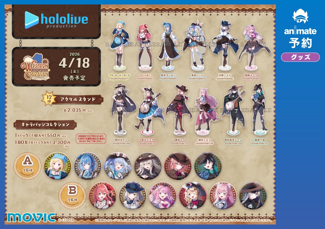 2026年4月18日より開催される『ホロライブプロダクション ウエスタンキャラバン in animate』では、星街すいせい / さくらみこ / 儒烏風亭らでん / 兎田ぺこら / 博衣こより / 白銀ノエル / 尾丸ポルカ / 輪堂千速 / 姫森ルーナ / 鷹嶺ルイ / 獅白ぼたん / アキ・ローゼンタールたちが、“ウエスタン”衣装に身を包むイラストを使用したグッズが登場!