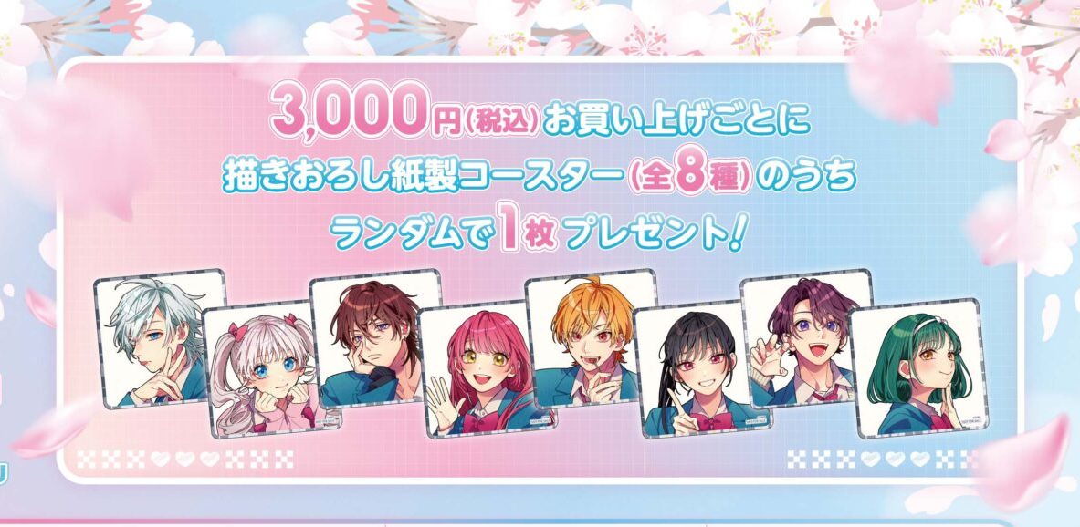 「HoneyWorks」ポップアップストアにて、グッズをお買い上げ3,000円毎に特典として「紙製コースター 全8種」がランダムに1枚プレゼントされる。