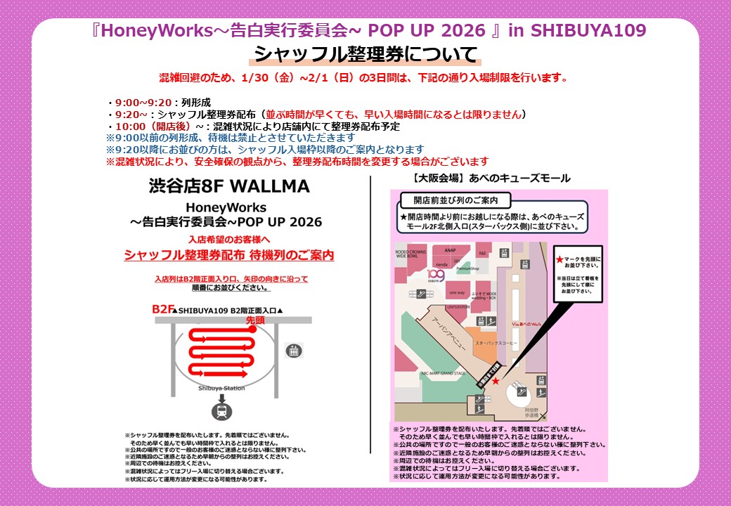 ニコニコ動画、YouTubeなどの動画投稿サイトを中心に活動する、関連動画総再生回数25億回を超えるクリエイターユニット「HoneyWorks (ハニーワークス / ハニワ)」のポップアップストアが、SHIBUYA109 東京・SHIBUYA109渋谷店8階「WALLMA」/ 大阪・あべのキューズモール2階 SHIBUYA109阿倍野店「WALLMA」にて、2026年1月30日〜2月19日まで開催される。