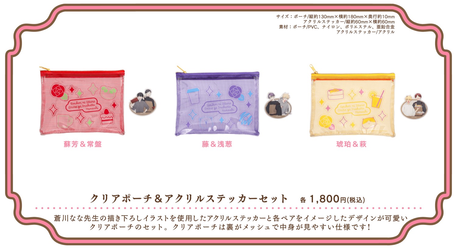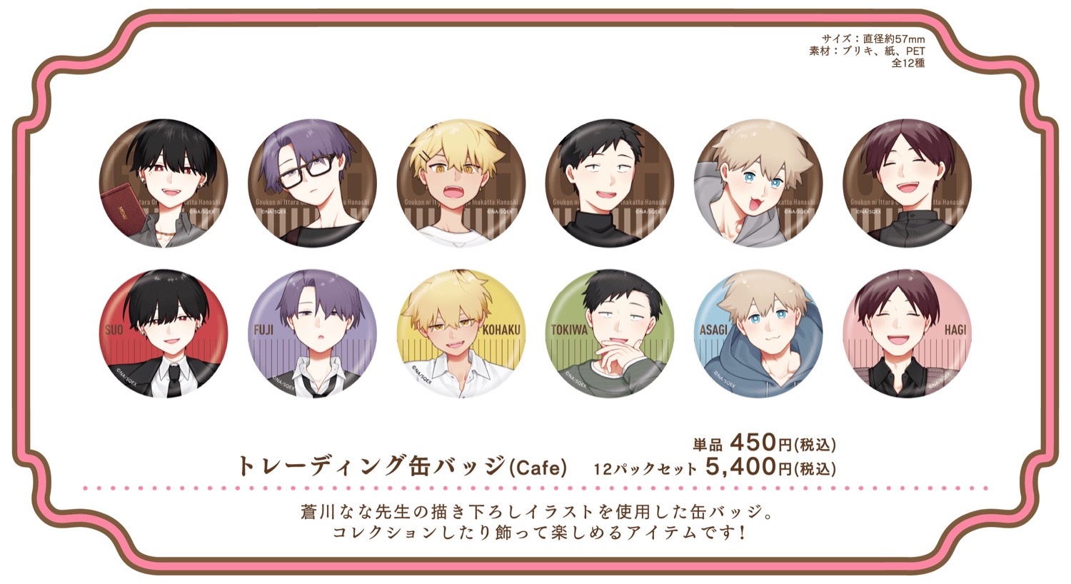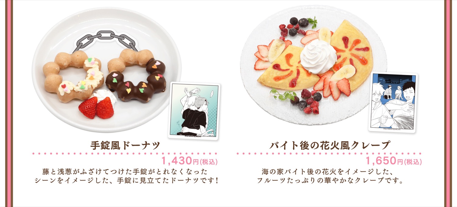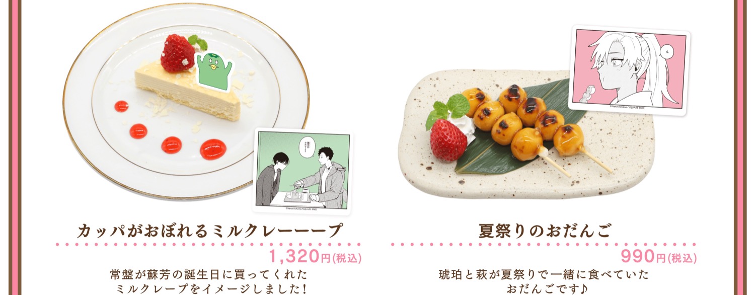 「合コンに行ったら女がいなかった話」カフェでは、作中の印象的なシーンやキャラクターをイメージしたコラボメニューが登場するほか、蘇芳・藤・琥珀・常盤・浅葱・萩がカフェ店員衣装に身を包む描き下ろしイラストを使用したグッズが登場!