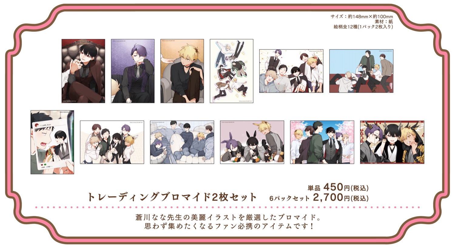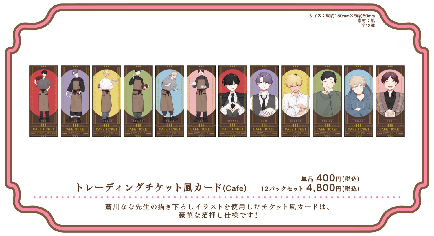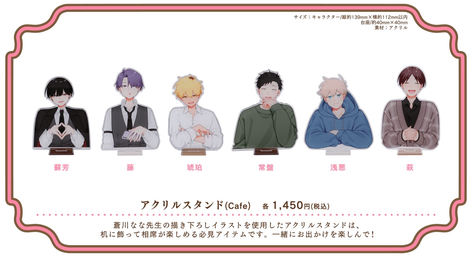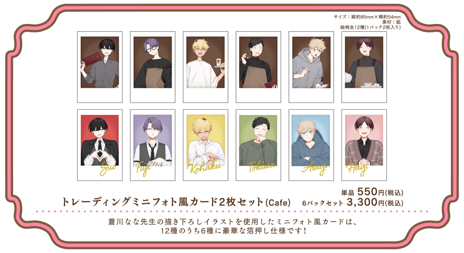 2026年4月29日〜7月5日までの期間限定で開催される、「合コンに行ったら女がいなかった話 カフェ」では、蘇芳・藤・琥珀・常盤・浅葱・萩がカフェ店員衣装に身を包む描き下ろしイラストを使用したグッズが登場!