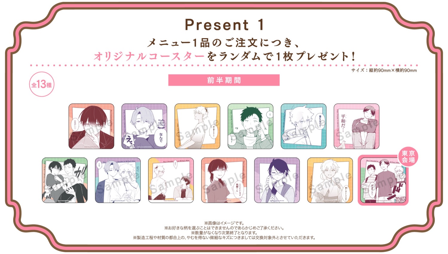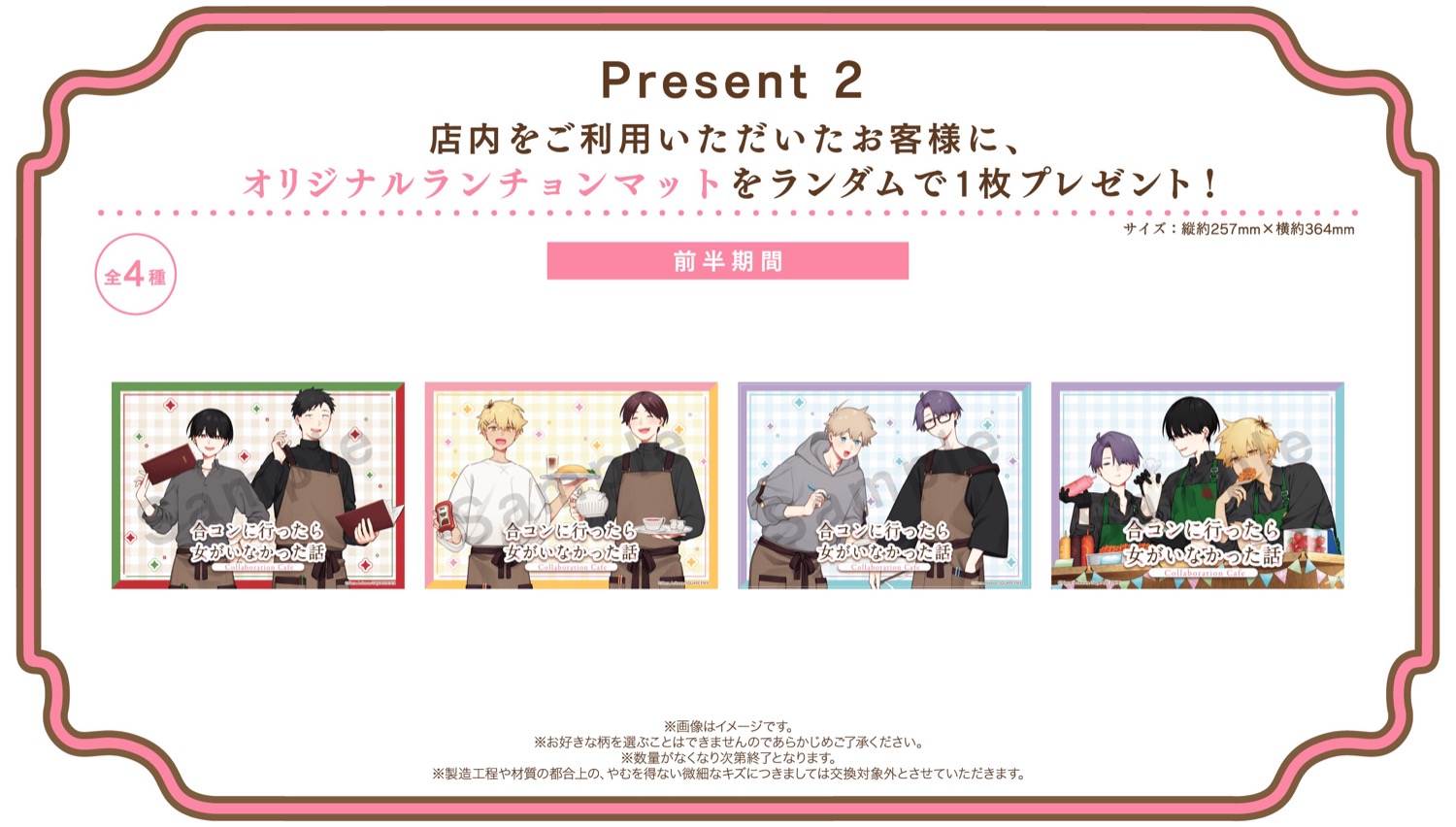 「合コンに行ったら女がいなかった話」コラボカフェでは、コラボメニューを1品注文するごとに「コースター」を1枚、店内利用で「ランチョンマット」を1枚ランダムに、1回の来店でグッズを3,000円(税込)購入すると「名刺風カード」をランダムに1枚プレゼント!