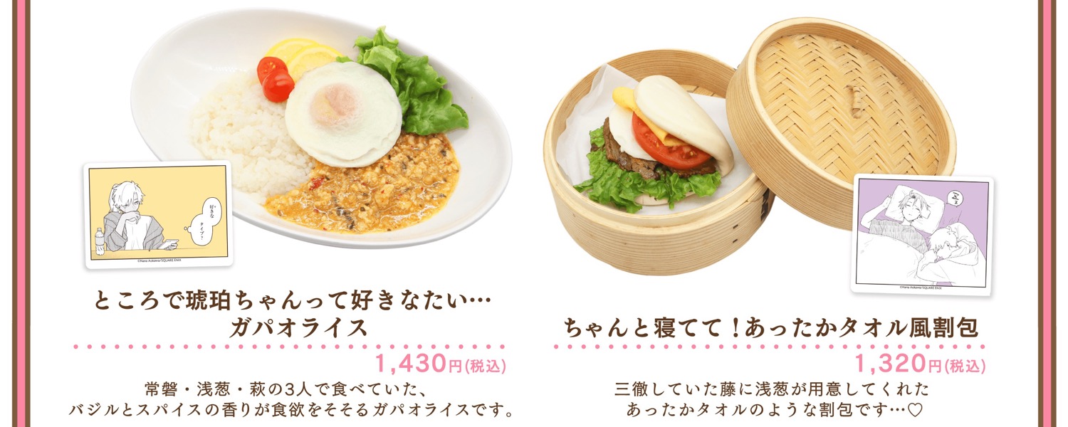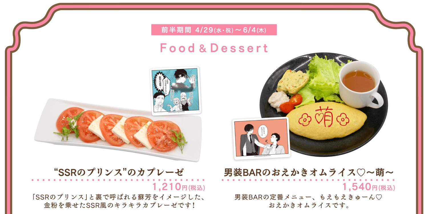 「“SSRのプリンス”のカプレーゼ」や「男装BARのおえかきオムライス♡~萌~」「ところで琥珀ちゃんって好きなたい…ガパオライス」などのメニューがラインナップ!