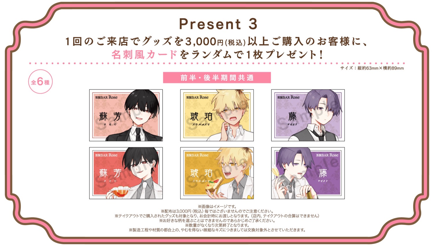 さらに、コラボメニューを1品注文するごとに「コースター」を1枚、店内利用で「ランチョンマット」を1枚ランダムに、1回の来店でグッズを3,000円(税込)購入すると「名刺風カード」をランダムに1枚プレゼント!