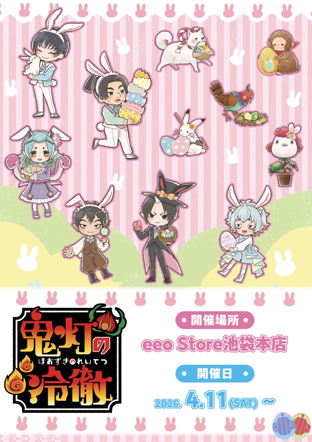江口夏実先生による人気漫画を原作としたアニメ「鬼灯の冷徹」から、鬼灯・お香・唐瓜・茄子・白澤たちが「イースターver.」をテーマに描かれた新規グラフアートの新作グッズが、eeo Store 池袋本店にて2026年4月11日より発売される。