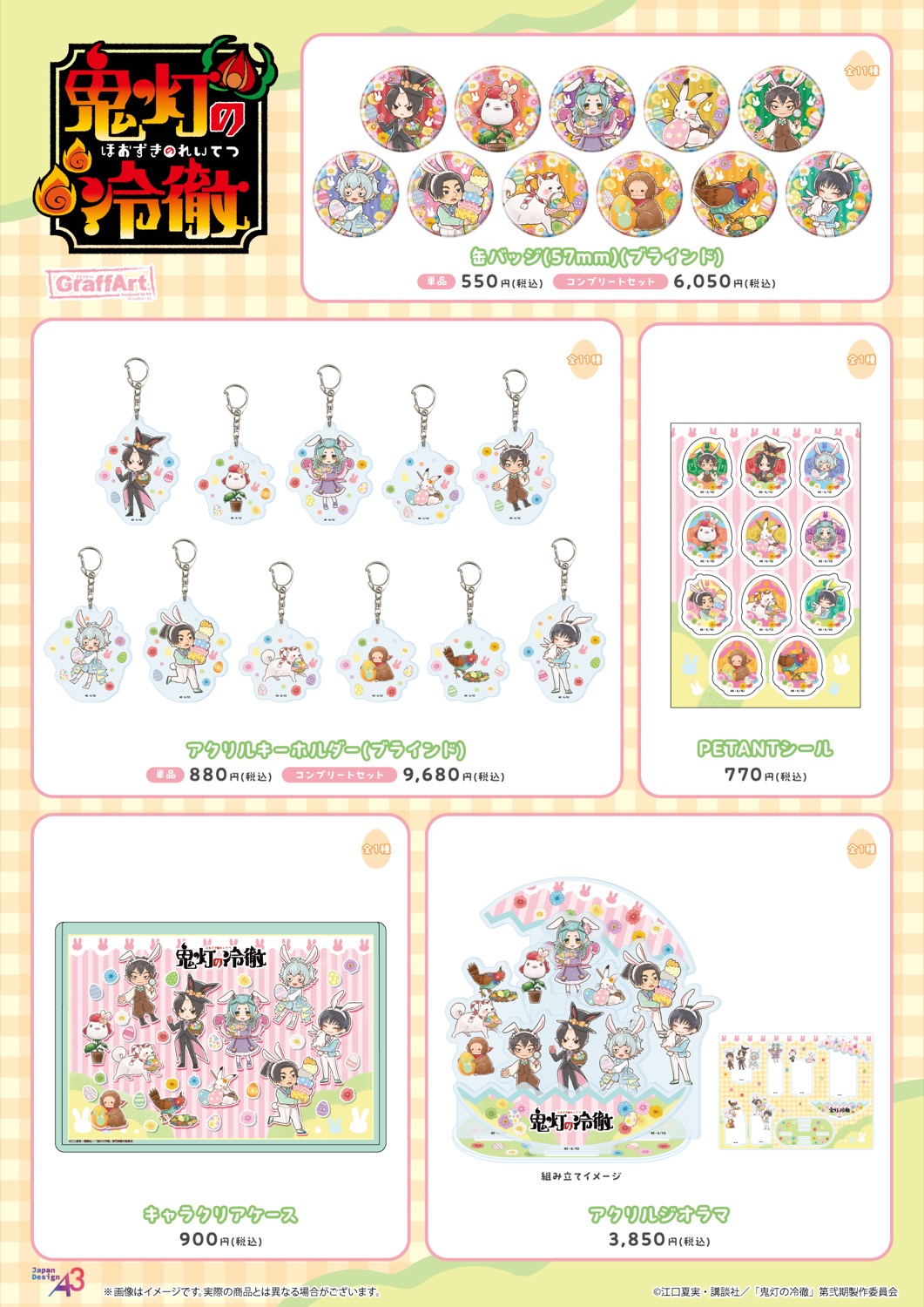 「イースターver.」をテーマに描かれた、鬼灯・お香・唐瓜・茄子・白澤たちの新規グラフアートを使用した「缶バッジ」「アクリルキーホルダー」「アクリルジオラマ」「キャラクリアケース」などがラインナップする。
