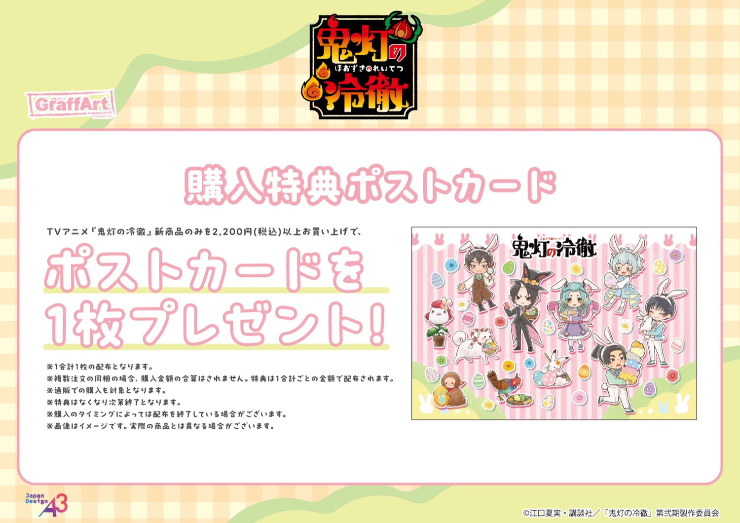 「鬼灯の冷徹」ポップアップストアにて、新商品のみを2,200円(税込)以上ご購入すると、特典としてノベルティー「ポストカード」を1枚プレゼント!
