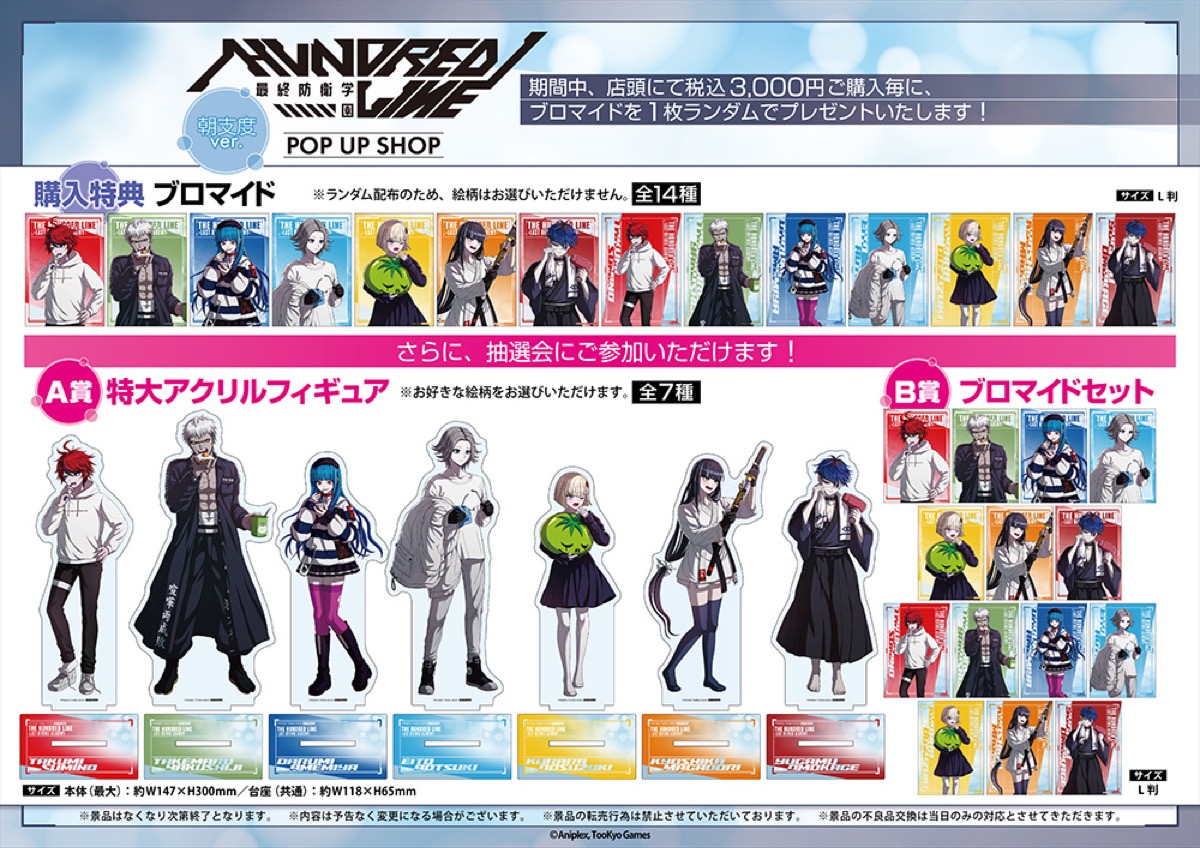 「HUNDRED LINEハンドレッドライン -最終防衛学園-」ポップアップストアでは、イベント限定の「朝支度」コンセプトの描き下ろしイラストを使用した新作グッズが多数販売される他、グッズをお買い上げ3,000円(税込)ごとに特典として描き下ろしノベルティ「ブロマイド 全14種」をランダムに1枚プレゼント!