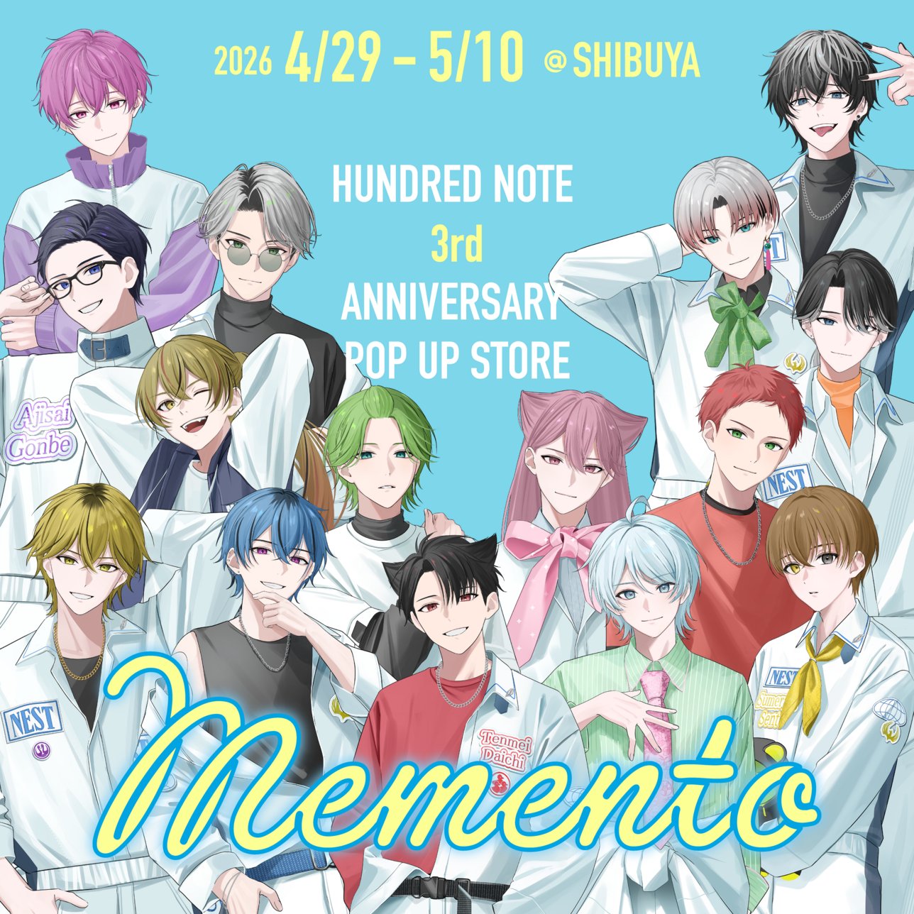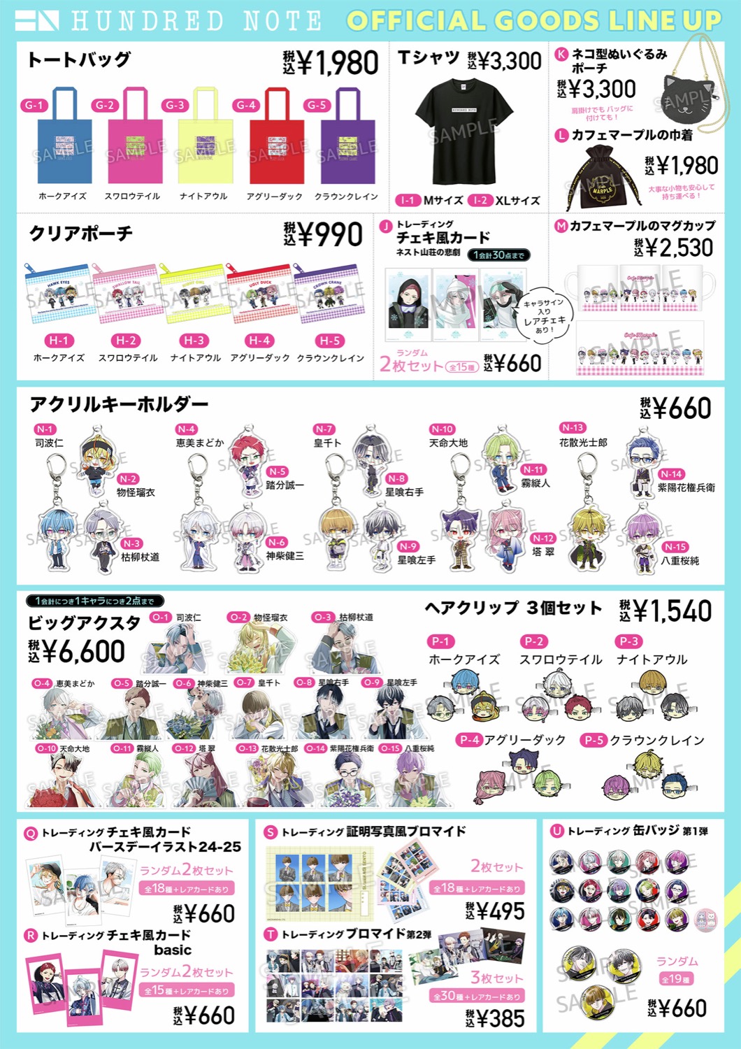 「HUNDRED NOTE (ハンドレッドノート)」ポップアップストアでは、司波仁・物怪瑠衣・枯柳杖道・恵美まどか・踏分誠一・神柴健三・皇千ト・星喰右手・星喰左手・天命大地・霧縦人・塔翠・花散光士郎・紫陽花権兵衛・八重桜純たちが、「ネストオフィシャルユニフォーム姿」で描かれたビジュアルを使用したグッズが多数販売!