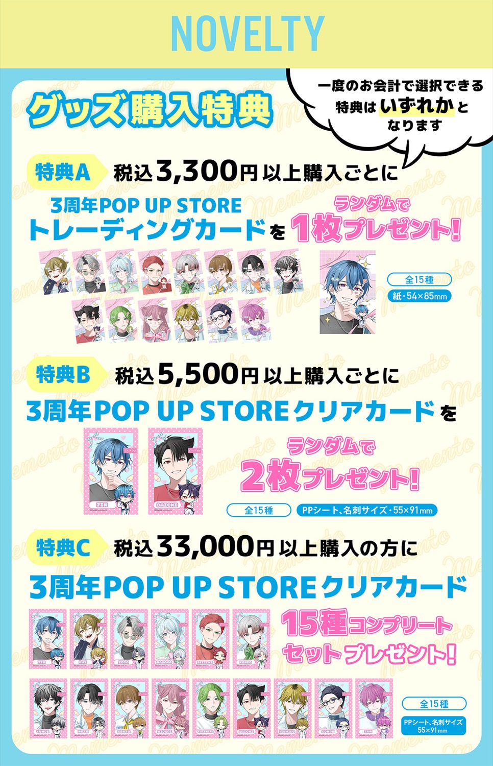 さらに、33,000円(税込)以上ご購入すると、特典として「特典C: クリアカード (全15種) / コンプリートセット」をプレゼント。※一度のお会計で選択できる特典は、特典A・特典B・特典Cのいずれかとなります。