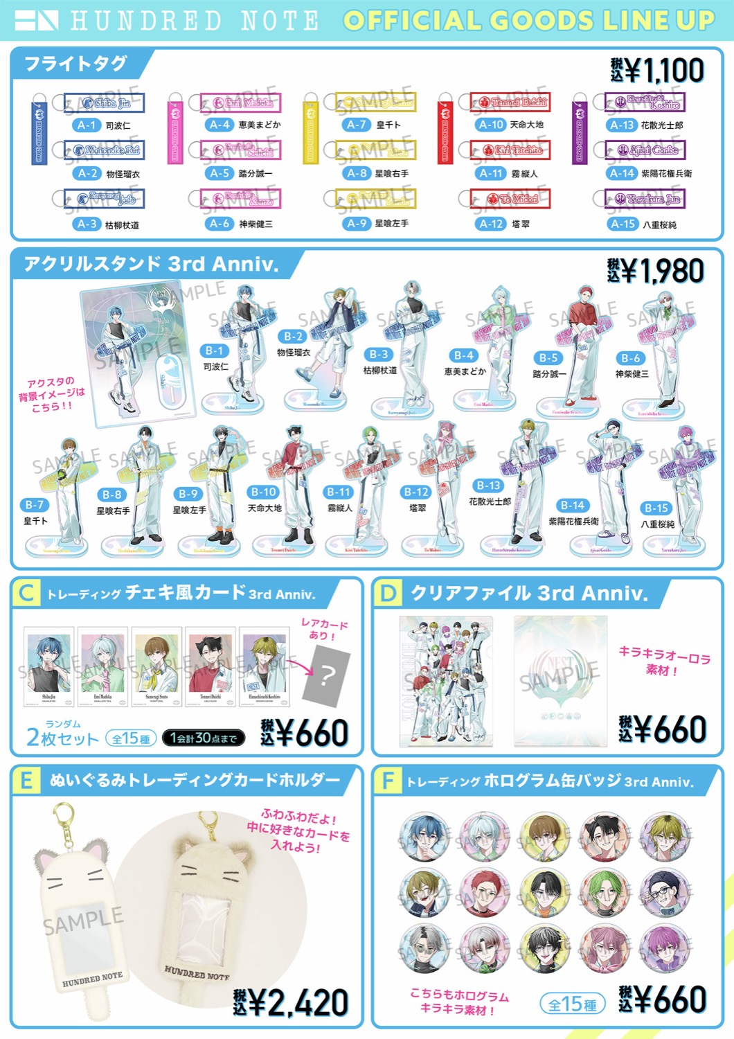 司波仁・物怪瑠衣・枯柳杖道・恵美まどか・踏分誠一・神柴健三・皇千ト・星喰右手・星喰左手・天命大地・霧縦人・塔翠・花散光士郎・紫陽花権兵衛・八重桜純たちのビジュアルを使用した「アクリルキーホルダー」「証明写真風ブロマイド」「アクリルスタンド 3rd Anniv.」などがラインナップする。