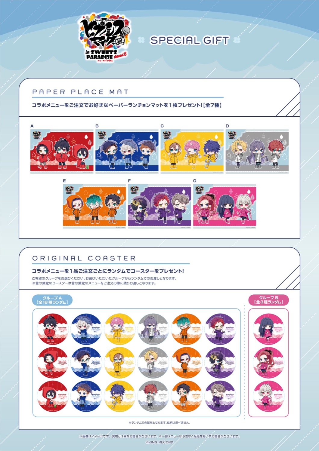 「ヒプノシスマイク × スイーツパラダイス」コラボにて、コラボメニューを1品注文すると特典として「ペーパーランチョンマット (全7種)」よりお好きな柄を1枚、コラボメニューを1品注文するごとに特典として注文メニューに応じて「オリジナルコースター グループA (全18種) / グループB (全3種)」をランダムに1枚プレゼント!
