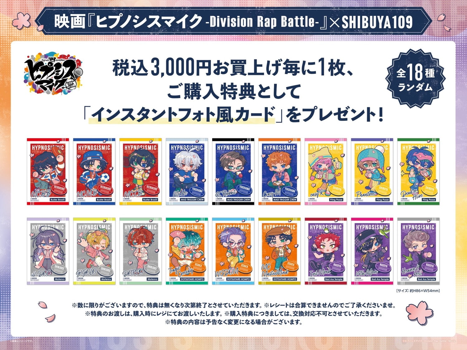 映画「ヒプノシスマイク -Division Rap Battle- (ヒプムビ)」ポップアップストアにて、グッズをお買い上げ3,000円(税込)毎に特典として「インスタントフォト風カード 全18種」がランダムに1枚プレゼントされる。