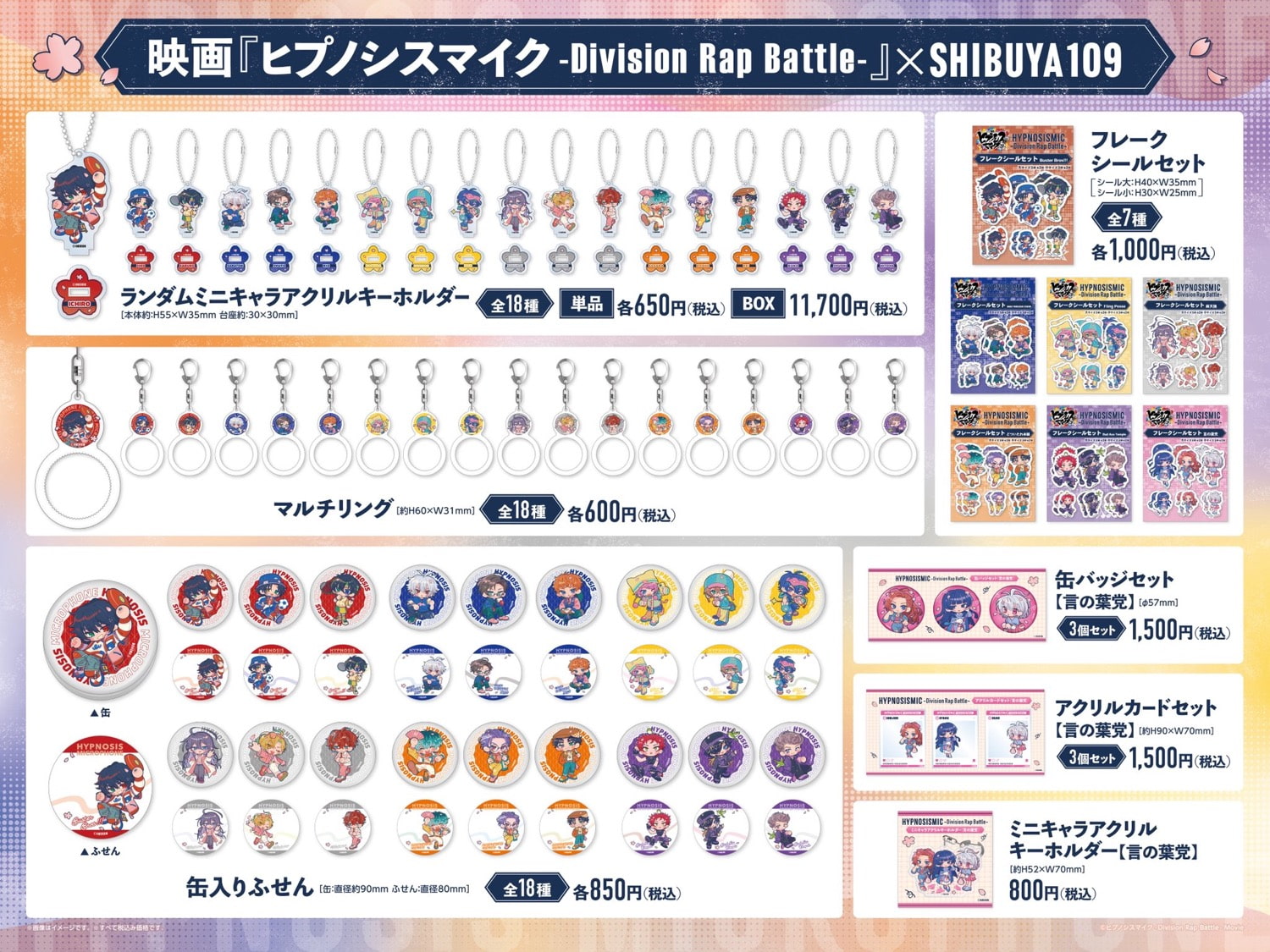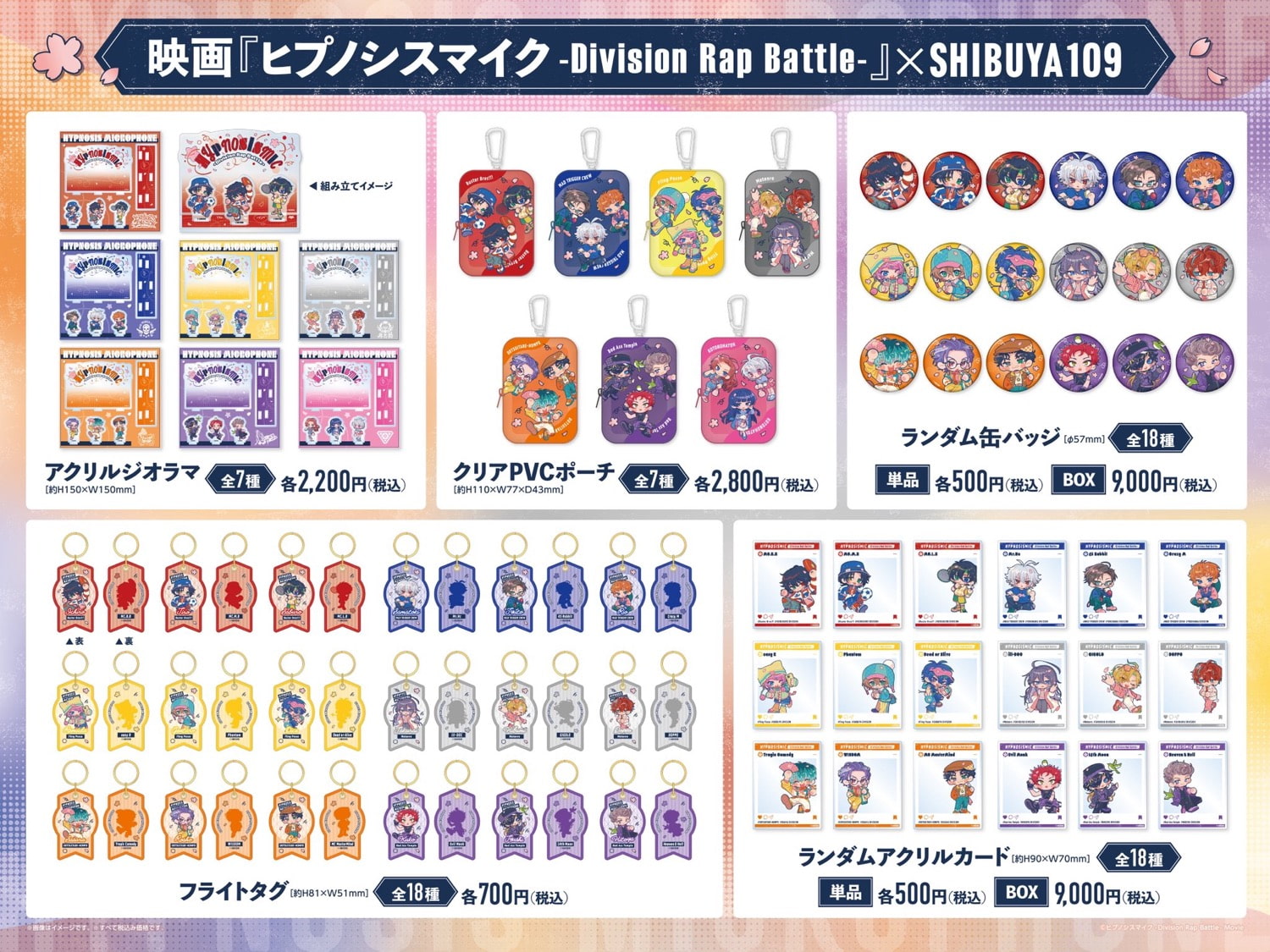 「お花見」をテーマに描かれた、山田 一郎・碧棺 左馬刻・飴村 乱数・神宮寺 寂雷・白膠木 簓・波羅夷 空却たちのイラストを使用した「アクリルジオラマ」「クリアPVCポーチ」「フライトタグ」「マルチリング」などがラインナップする。
