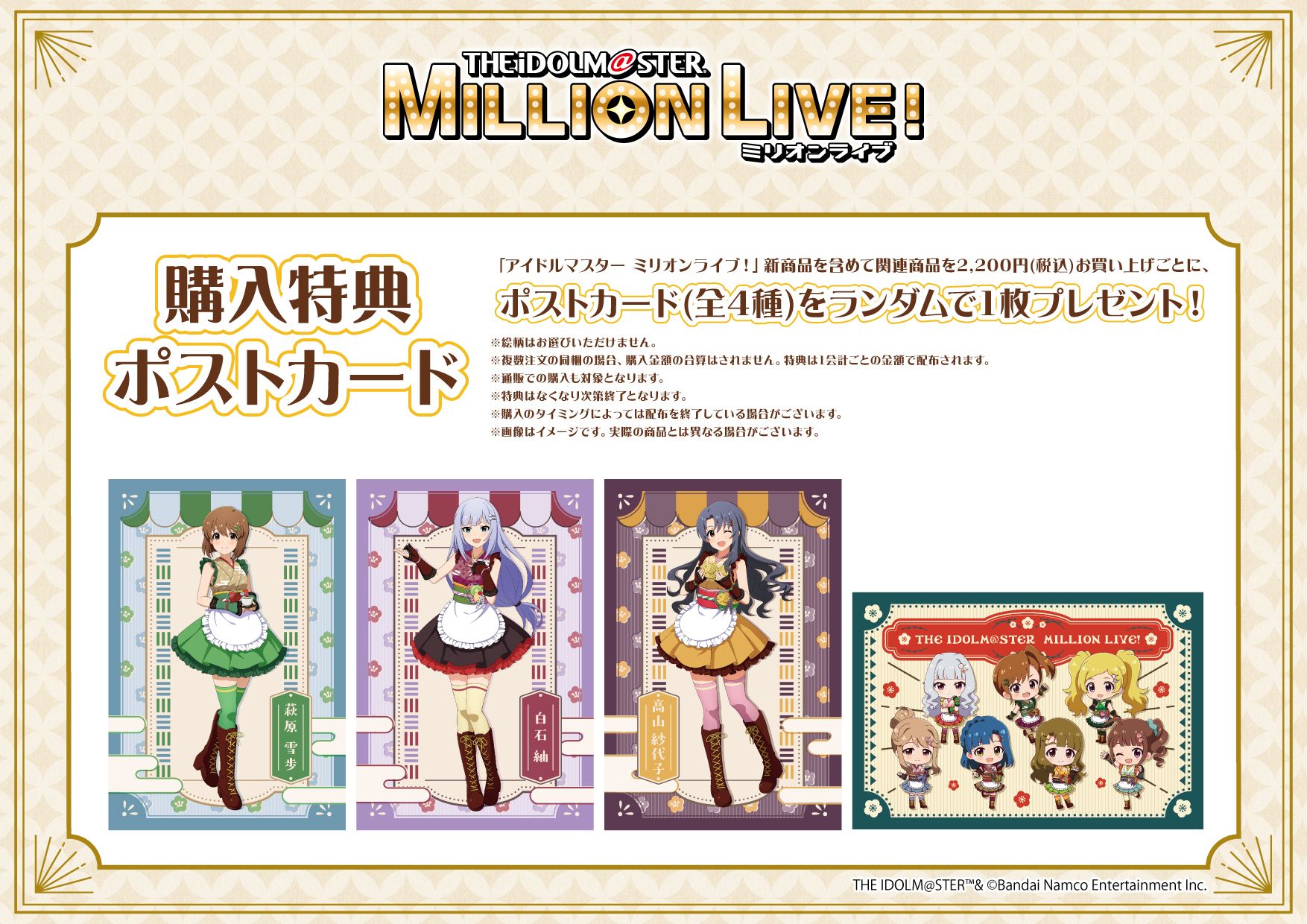 「アイドルマスター ミリオンライブ! (ミリマス)」ポップアップストアにて、新商品を含めて関連商品を2,200円(税込)ご購入ごとに、特典として「ポストカード 全4種」がランダムに1枚プレゼントされる。