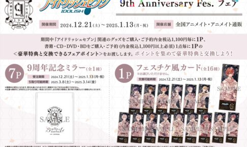 バンダイナムコオンラインが贈るスマホ向け人気ゲーム「アイドリッシュセブン (アイナナ)」の『アイドリッシュセブン 9th Anniversary Fes. フェア』が、全国のアニメイトにて2024年12月21日〜2025年1月13日までの期間限定で開催される。