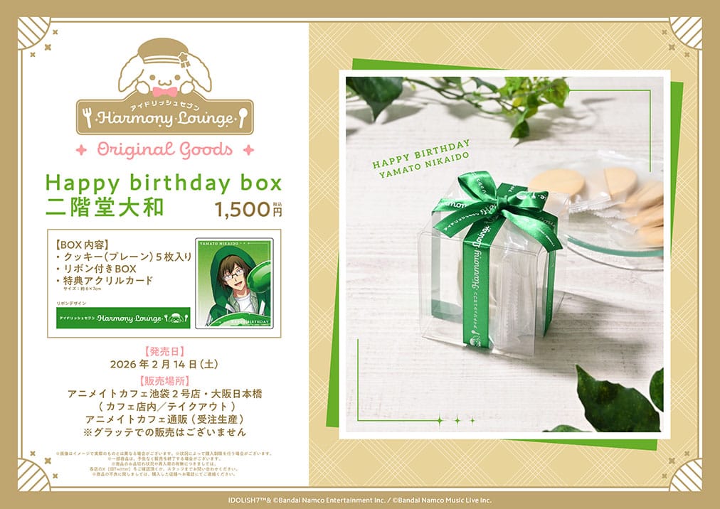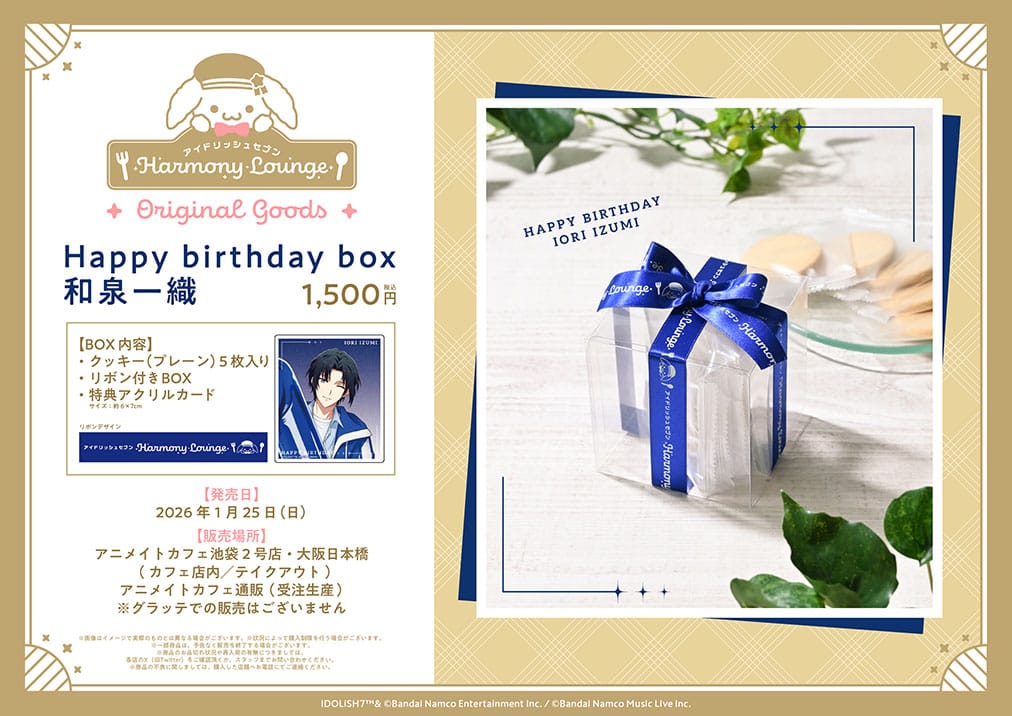さらに、描き起こしミニキャラビジュアルを使用したコラボカフェ限定グッズ、期間中に誕生日を迎える和泉一織と二階堂大和のバースデーボックスも発売!