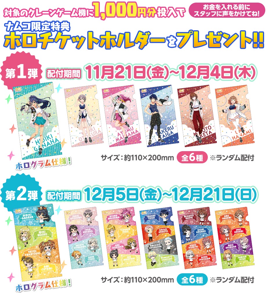 イベント開催店舗にて、スタッフに声をかけてから対象のクレーンゲーム機に1,000円投入した方に、ナムコ限定特典「ホロチケットホルダー」の中からランダムで1枚をプレゼント!