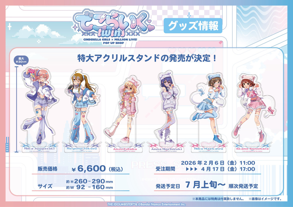 バンダイナムコネクサスが手掛ける大人気育成シミュレーションゲーム「アイドルマスター シンデレラガールズ (デレマス)」と、バンダイナムコエンターテインメントが展開するメディアミックス作品「アイドルマスター ミリオンライブ! (ミリマス)」のポップアップストア「でこらいくTWINS」が、タワーレコード(新宿店/京都店)にて2026年2月6日〜3月8日まで開催される。