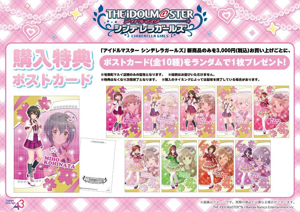 「アイドルマスター シンデレラガールズ」ポップアップストアにて新商品を含めて関連商品を3,000円(税込)以上お買い上げの方に、特典として描き下ろしノベルティー「ボストカード 全10種」が1会計につき1枚ランダムにプレゼントされる。