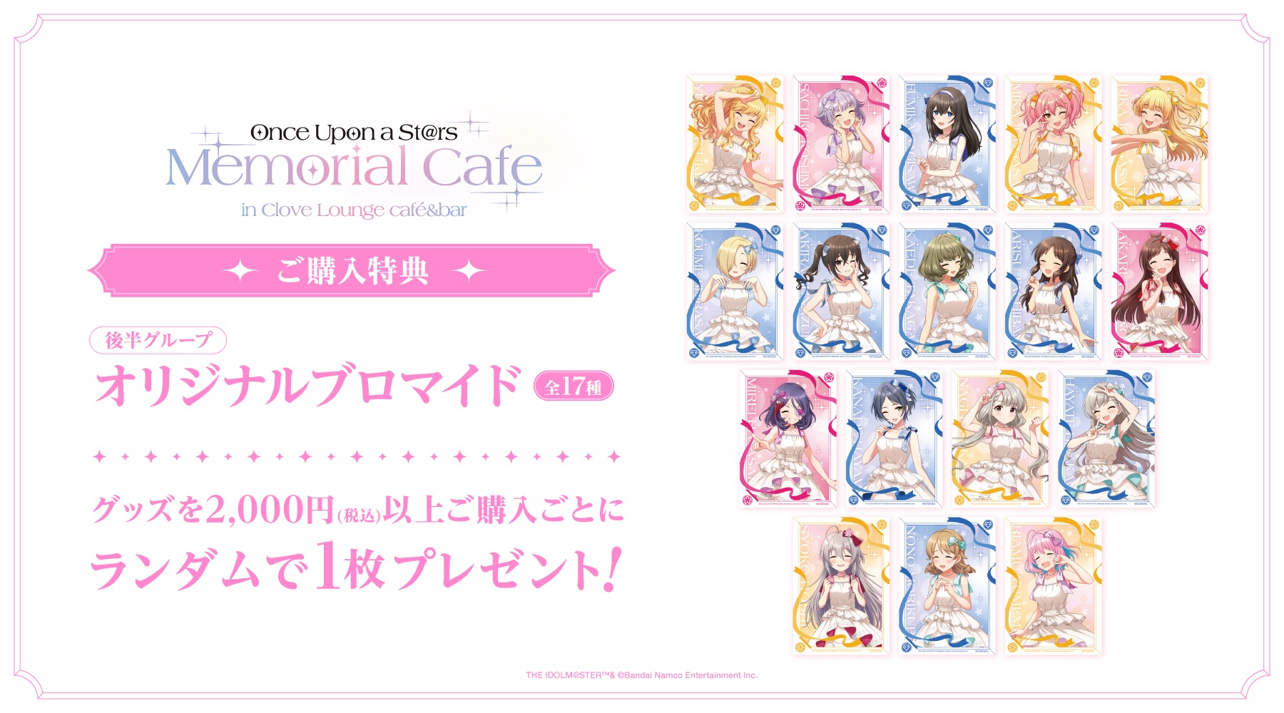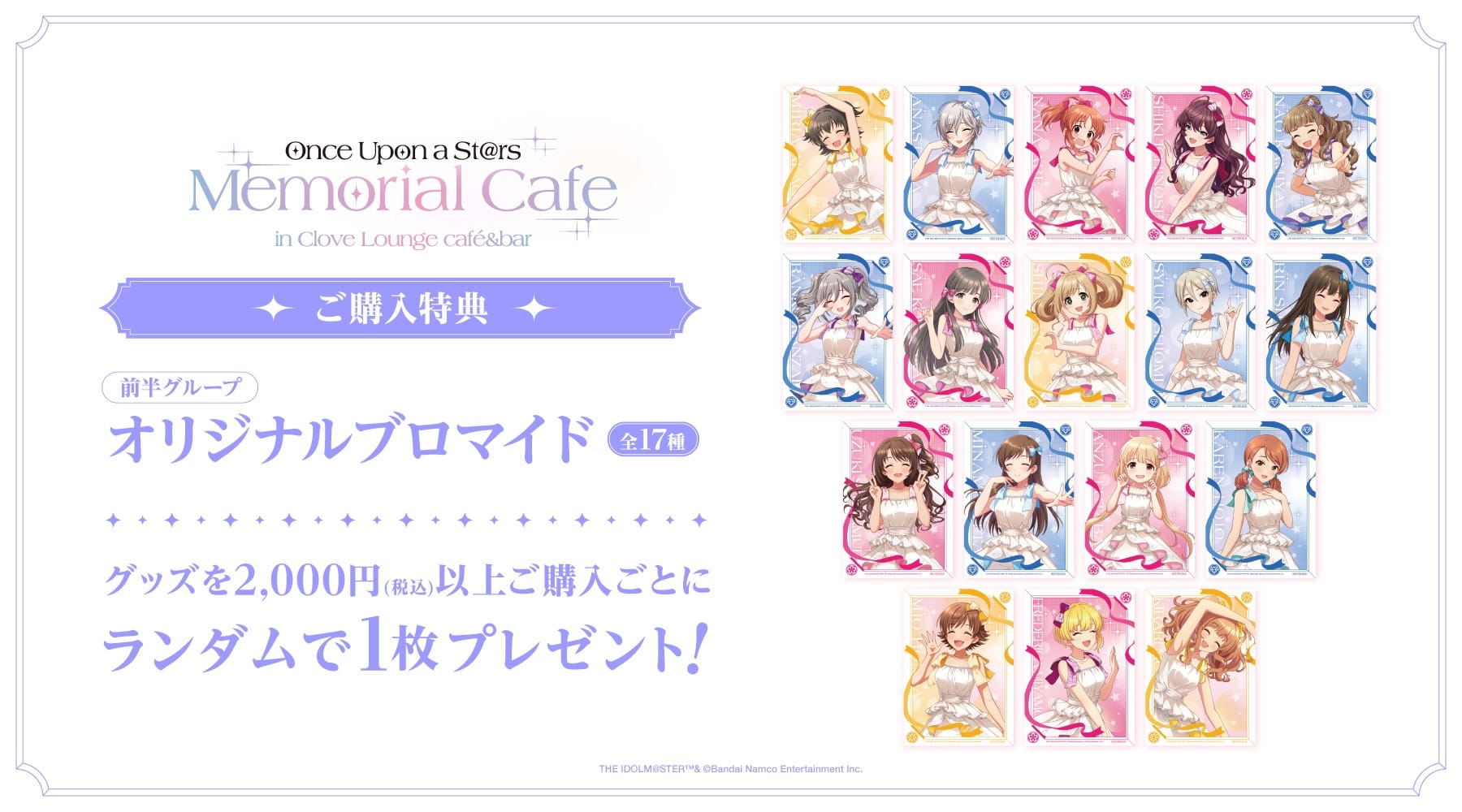 また、グッズを2,000円 (税込) 購入ごとに「オリジナルブロマイド」をランダムで1枚プレゼント。