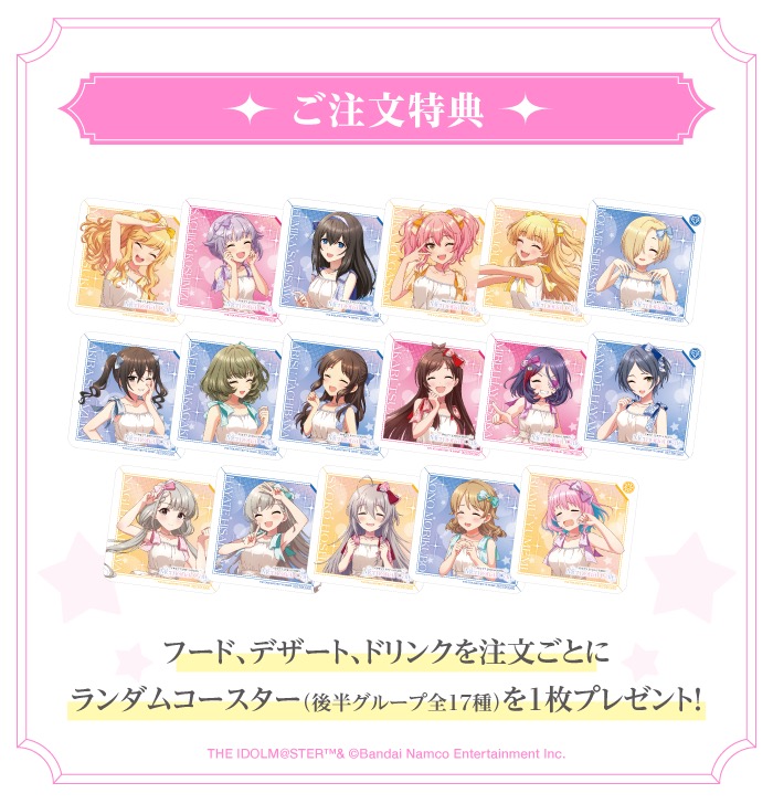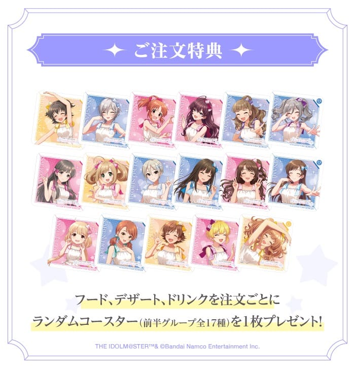 「デレマス × Clove Lounge Cafe & Bar 秋葉原」コラボにて、コラボメニューを1品注文ごとに特典として、描き下ろしイラストを使用した「ランダムコースター」がランダムに1枚プレゼントされる。