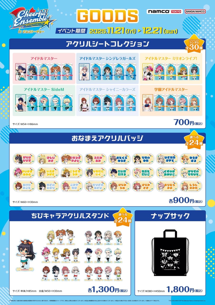 2025年11月21日〜12月21日までの期間限定で開催される『チアフルアンサンブル in ナムコトーキョー』では、描きおろし・描きおこしイラストを使用したオリジナルグッズが登場!
