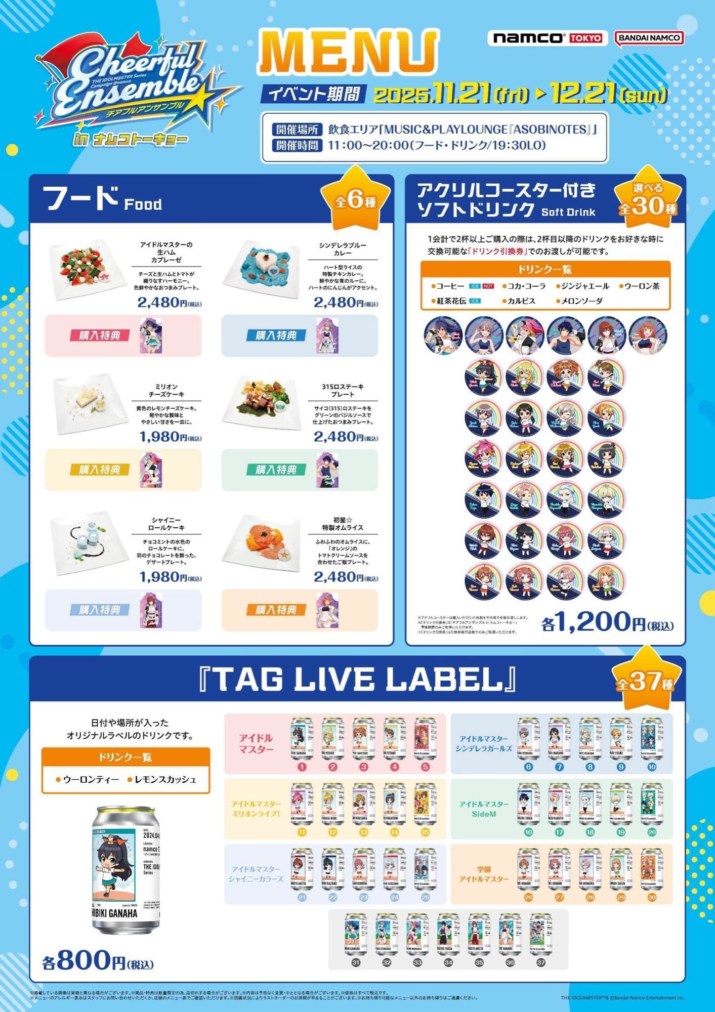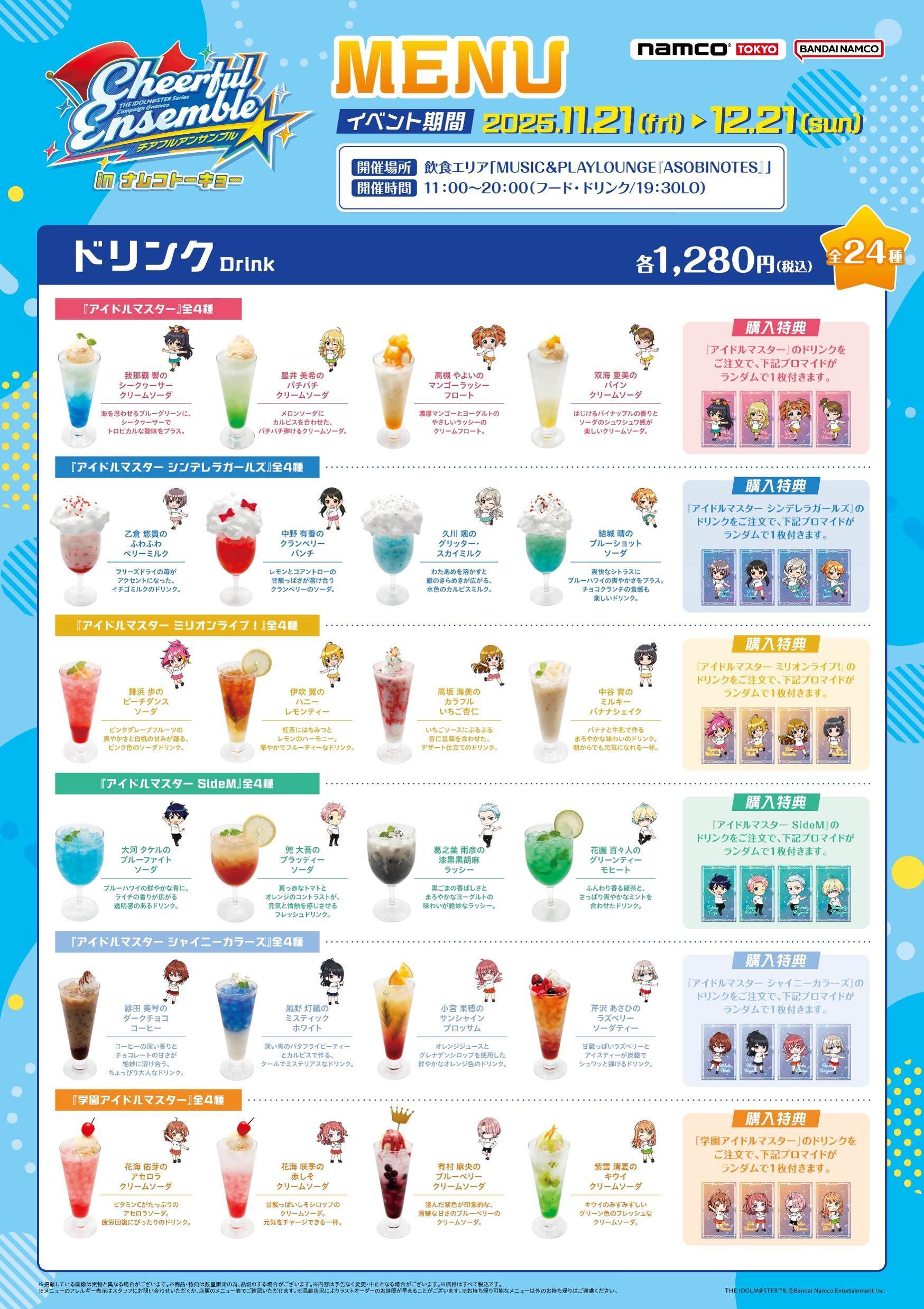 2025年11月21日よりnamco TOKYOにて開催されるコラボキャンペーン『チアフルアンサンブル in ナムコトーキョー』では、フロア内飲食スペースの「MUSIC&PLAYLOUNGE『ASOBINOTES』(アソビノオト)」にアイドル24名をそれぞれイメージしたオリジナルドリンクが登場。